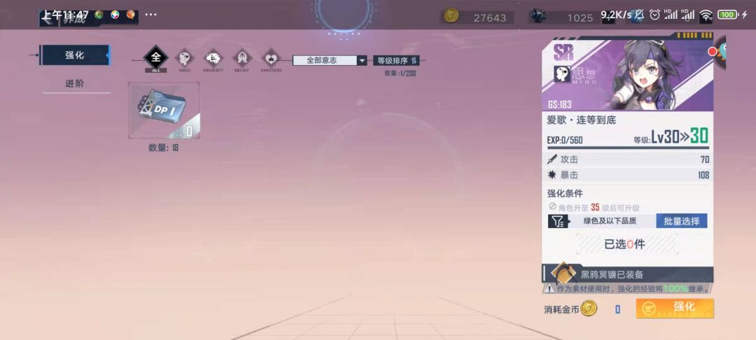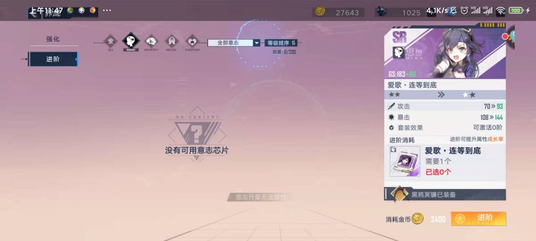 意志的养成同样有强化和进阶2种,强化可以用意志数据包和低级意志升级,进阶同样是用同名意志升星。