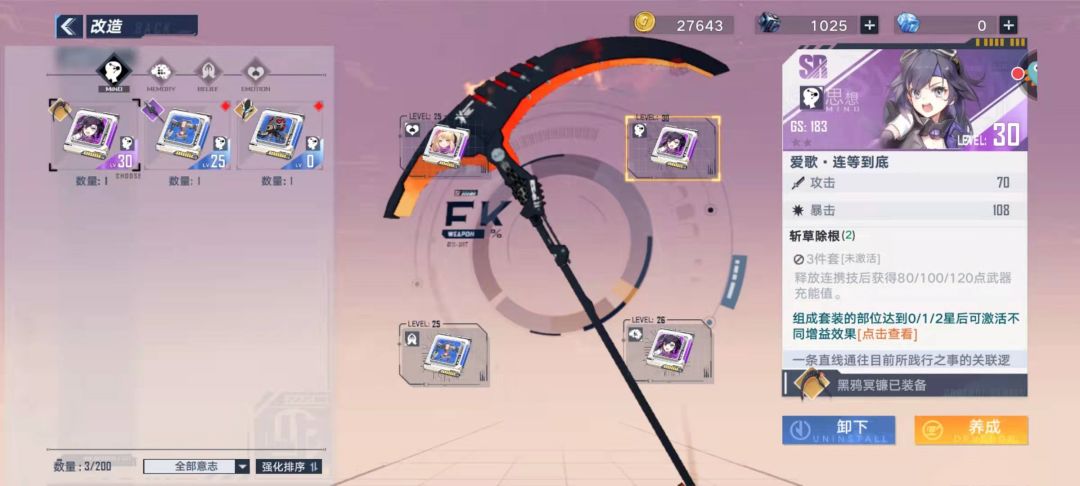 意志的主界面除了品质和GS加成图标还有意志立绘,N和R都是普通机械,SR,SSR分别为相应的拟态,意志的背后都有一个意味深长的故事大家有兴趣可以自行探索。