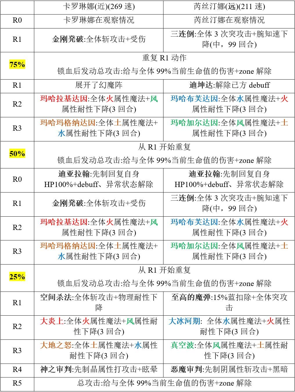 思路:由于第一回合双子先制恢复100%血,所以我们第一回合直接开AF,用AF来对抗先制,直接在AF中AF全员输出卡萝莉娜(里面),只需要把50%-25%,输出压力比较低,建议用as猫刀进AF,as猫刀在AF中使用一次美丽头纱三降为第四阶段增加输出环境;打到锁血后即可,另一只不用管。AF结束后剩下的双子先制恢复100%血,清除所有buff和异常;下一回合茶壶给降力,魔剑换圣骑(如果茶壶降力没中且魔剑被圣骑超速的话会翻车。。。求稳的话可以茶壶带个力之诅咒,这里用力之诅咒),学妹给降智,as猫刀正常输出。之后的回合圣骑按全属抗-降力-降智-全属抗-降力-降智循环即可,其他人正常输出打条,打满一条AF后,在双子要用3连突的回合,圣骑换魔剑,as猫刀换as希尔,之后开AF压血条,尽可能打输出,不过别打到锁血。一条AF不够就多打几条。