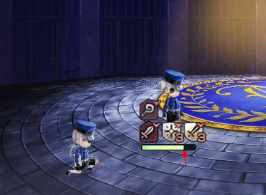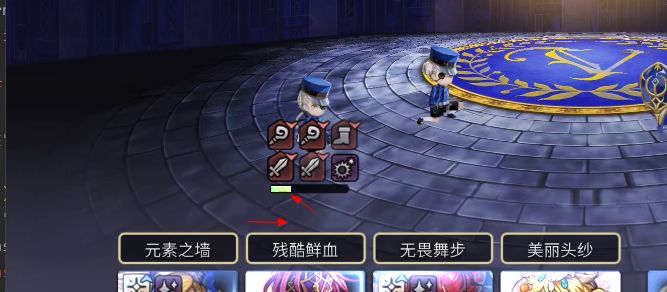 思路2(练习下卡血墙):平地输出打快到下图所示的血条后(比地板缝少一点点,差不多与debuff的层数对齐),茶壶换圣骑,如果是无痛状态,魔剑和as猫刀继续输出,学妹普通攻击;如果是痛状态,as猫刀继续输出,魔剑和学妹普攻。换完后下一回合,圣骑祈祷的圣剑降力或者元素之墙治愈都可以,魔剑上痛,学妹必爆,as艾尔加继续输出;接着下一回合圣骑换茶壶,其他人继续输出(此时有砍耐+痛+必爆,魔剑和学妹的输出很高,很容易打到锁血,也是后续卡血墙的通用套路),之后进入第二阶段。
