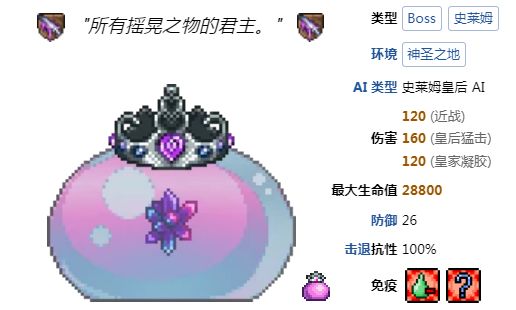 史莱姆皇后是1.4更新的全新神圣BOSS。与史莱姆王一样,史莱姆皇后是我们在困难模式中可以挑战的第一个BOSS。