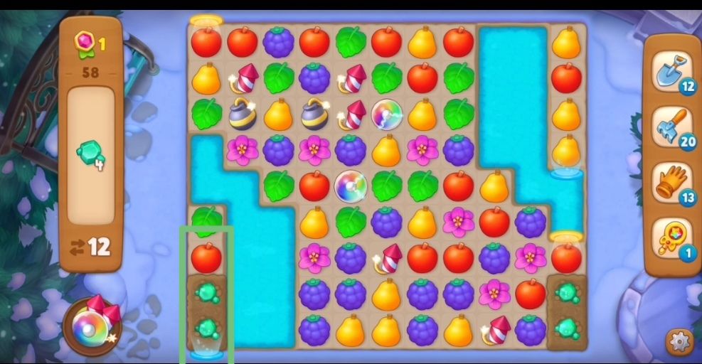 ④这一关很容易制造炸弹,因为土块比较厚,光靠元素匹配是不可行的,所以要制造烟花炸弹以及彩虹