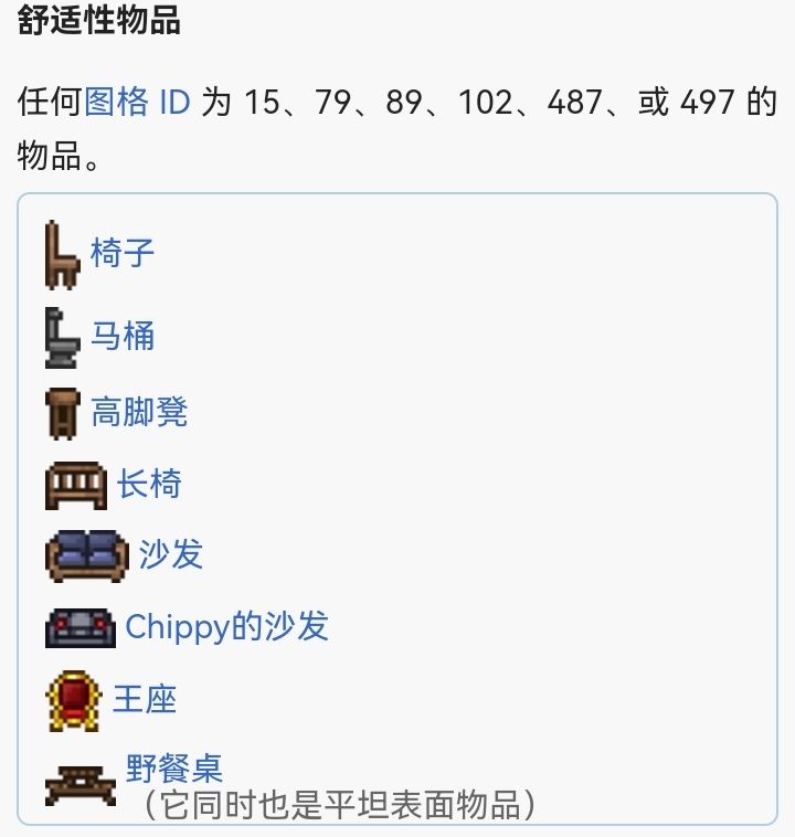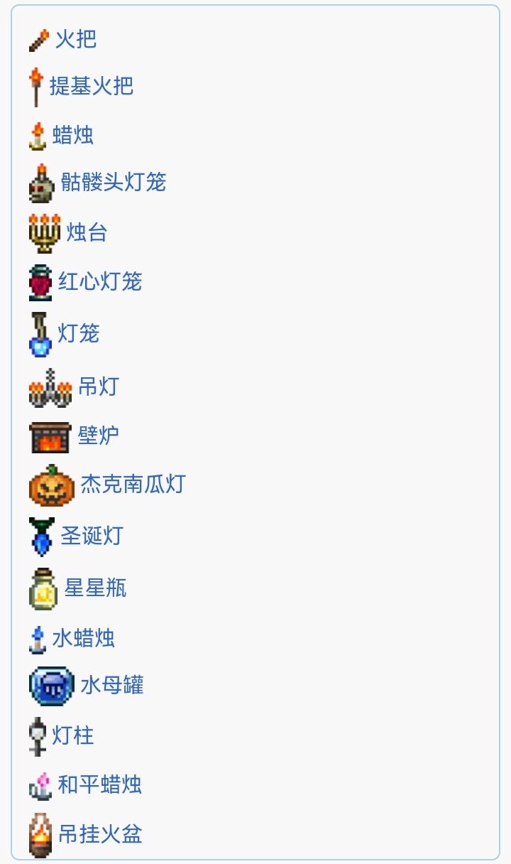 然后,下面就是我在wiki里找到的光源,平坦表面物品,舒适性物品的大全了。