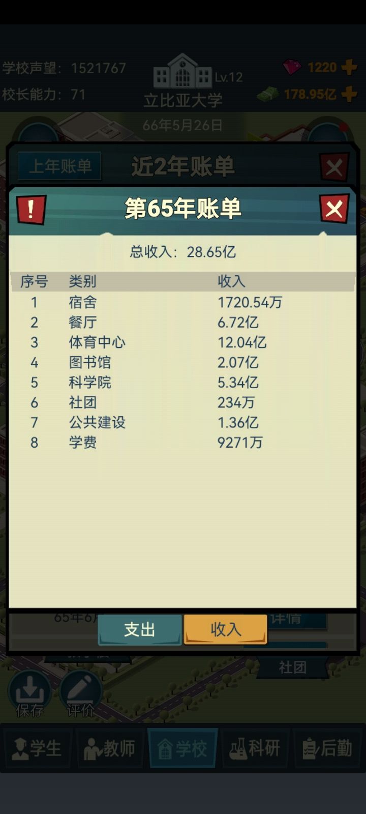 图书馆的收入也挺重要的,按照升星的要求做任务,快升星的时候换书并拉低价格。升到一级之后就可以拉到3.5或更高宰客了,赚的不少。前期别自动买书,抗不住的,等体育中心出来了再说吧。