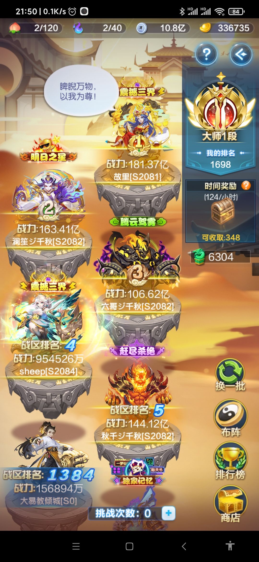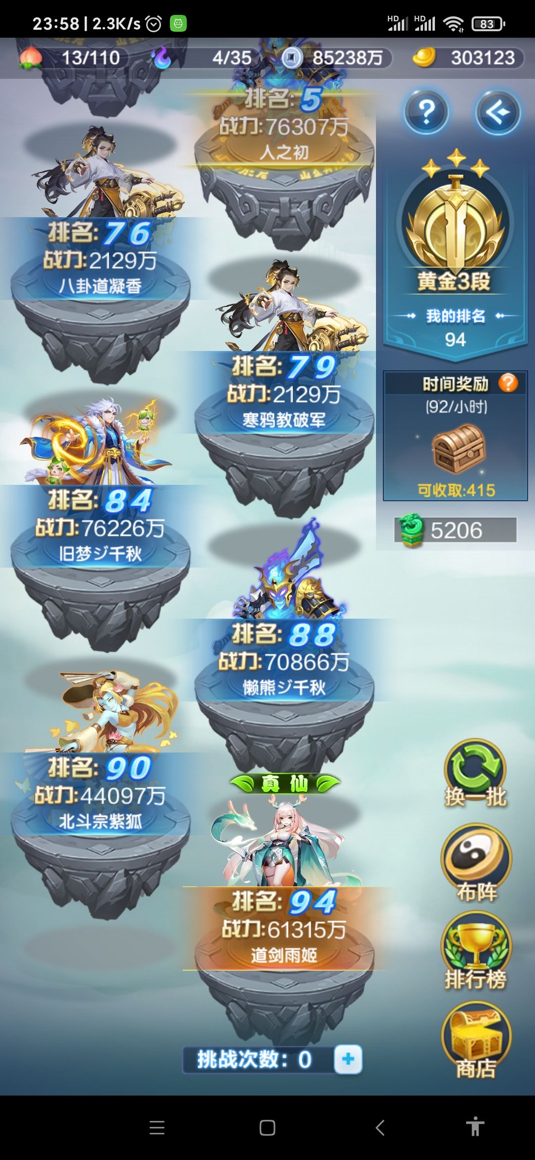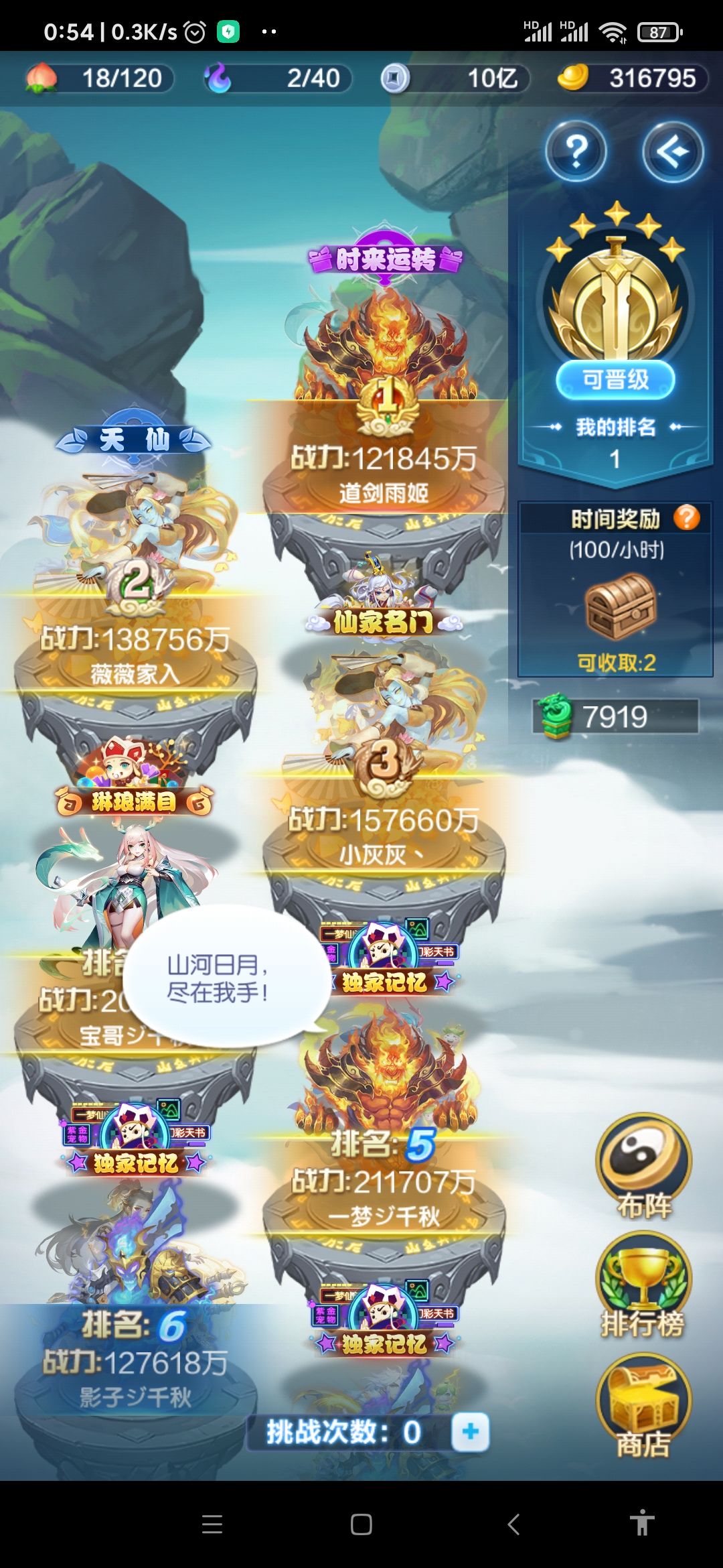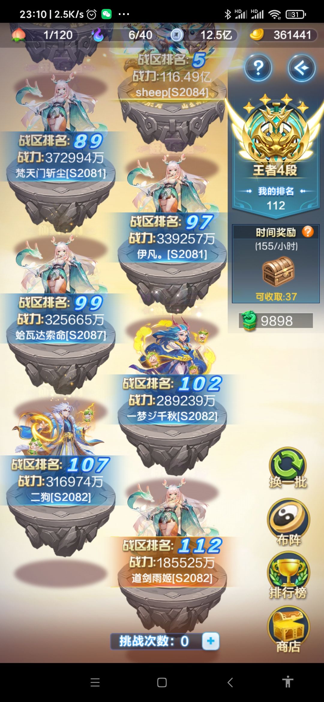 战力42亿、元宝34万,开了紫虚神仙,战力提升幅度很大,天宫终于通关了,副本37章,0星依赖于先手优势,不太会玩战力还是低了,竞技场进前200名有点吃力。