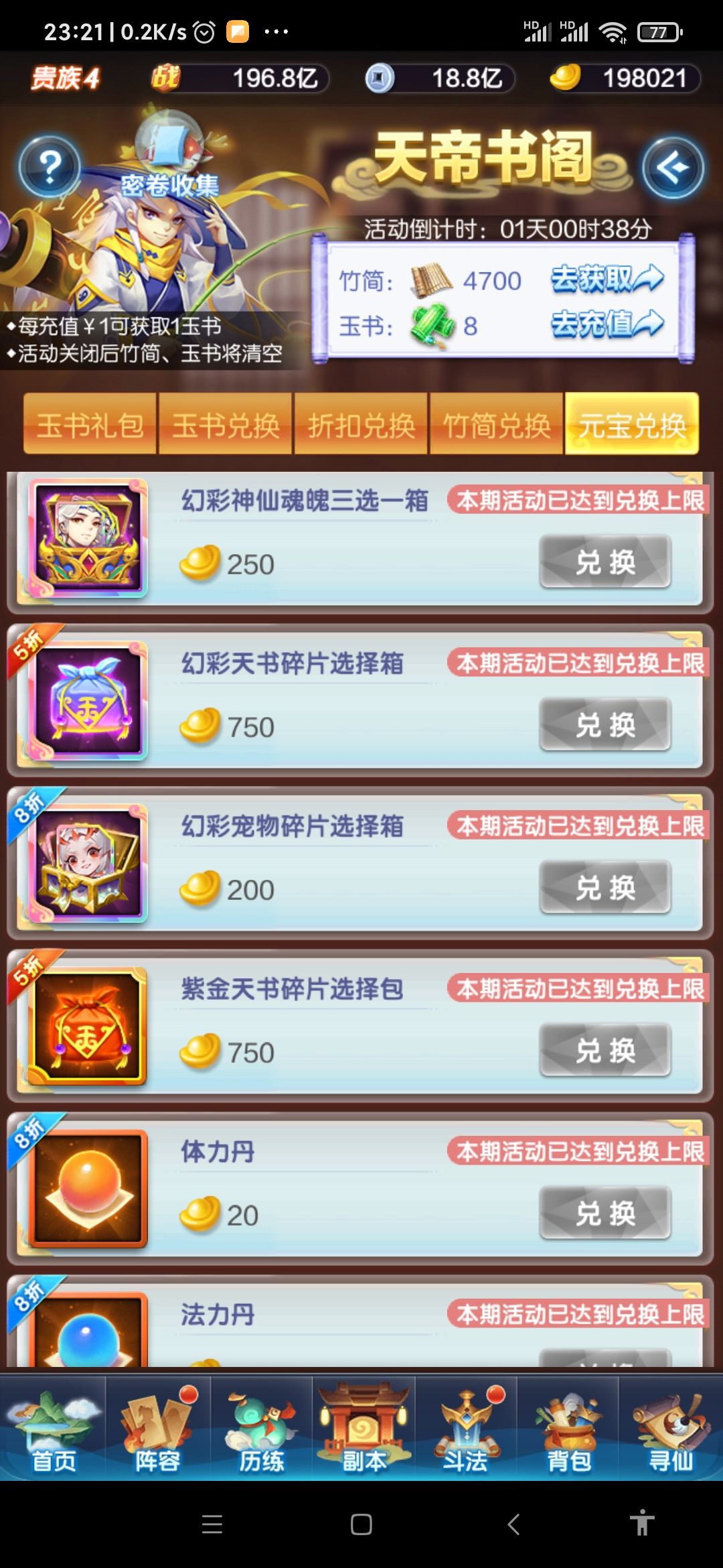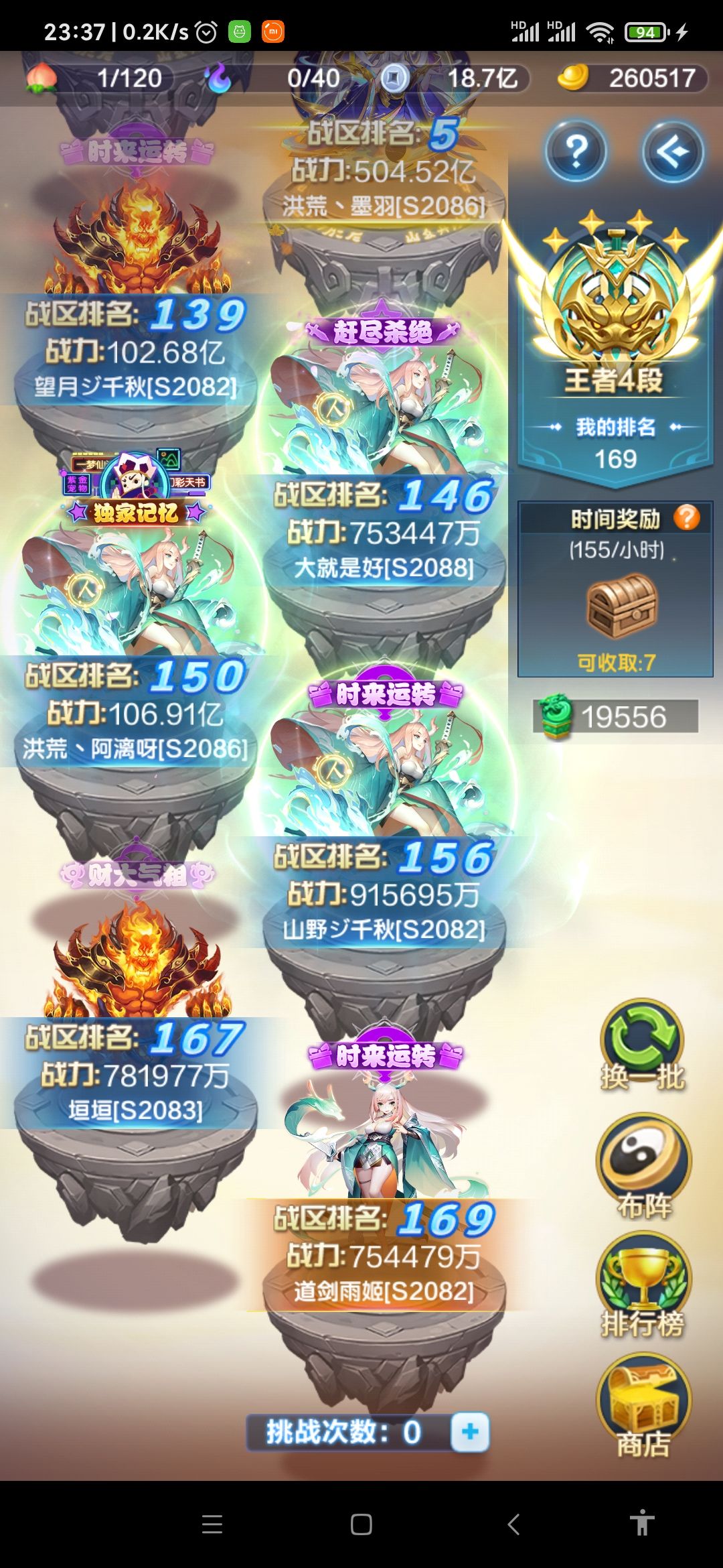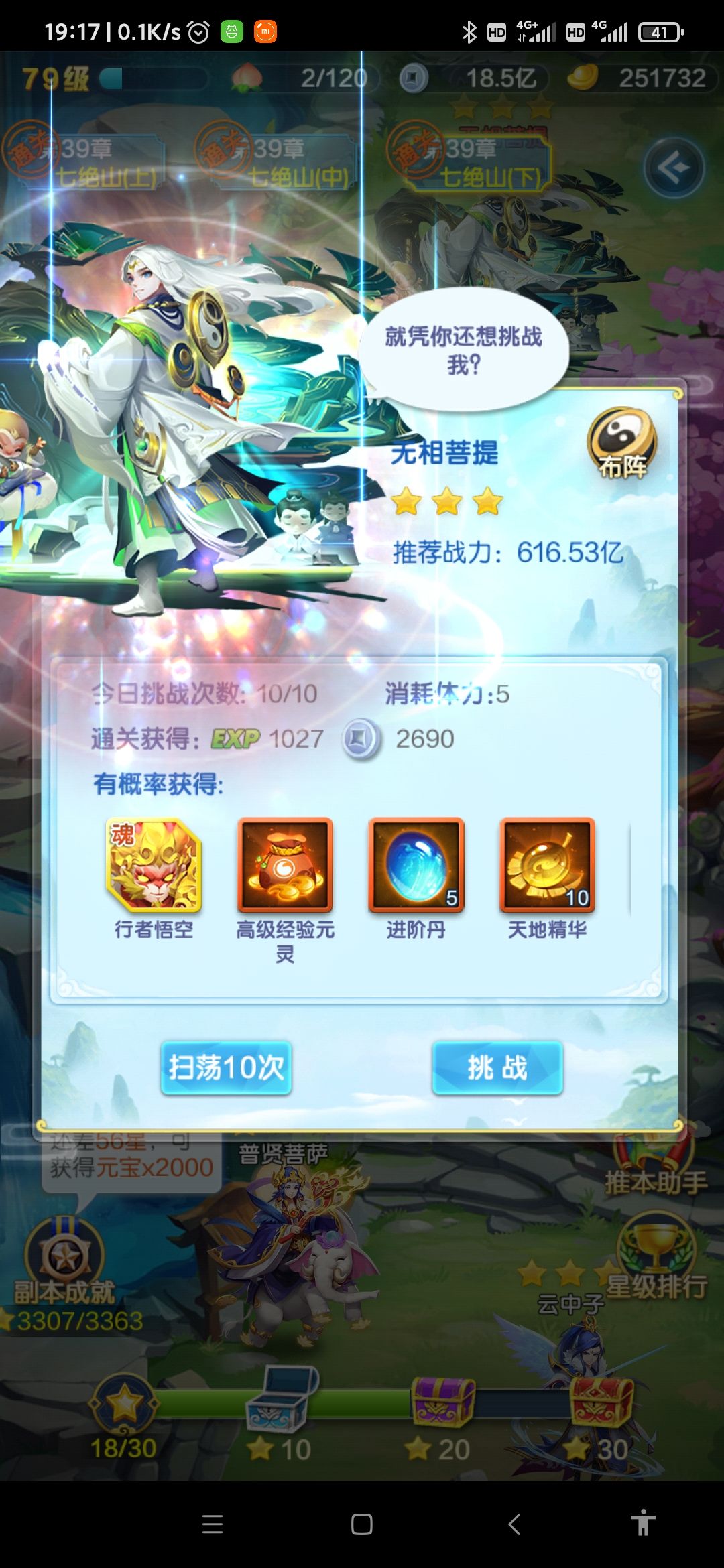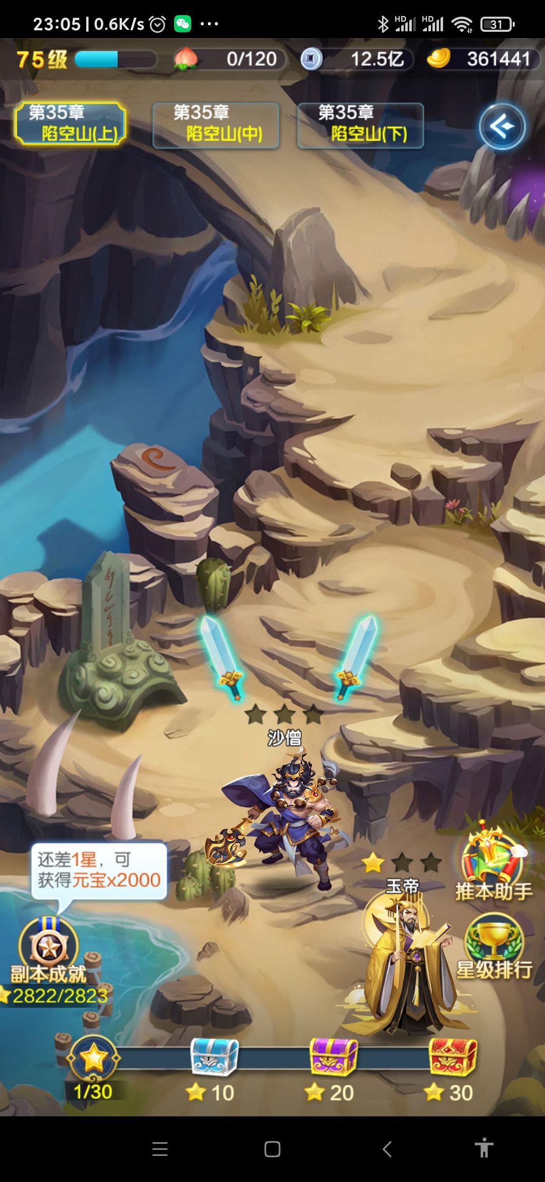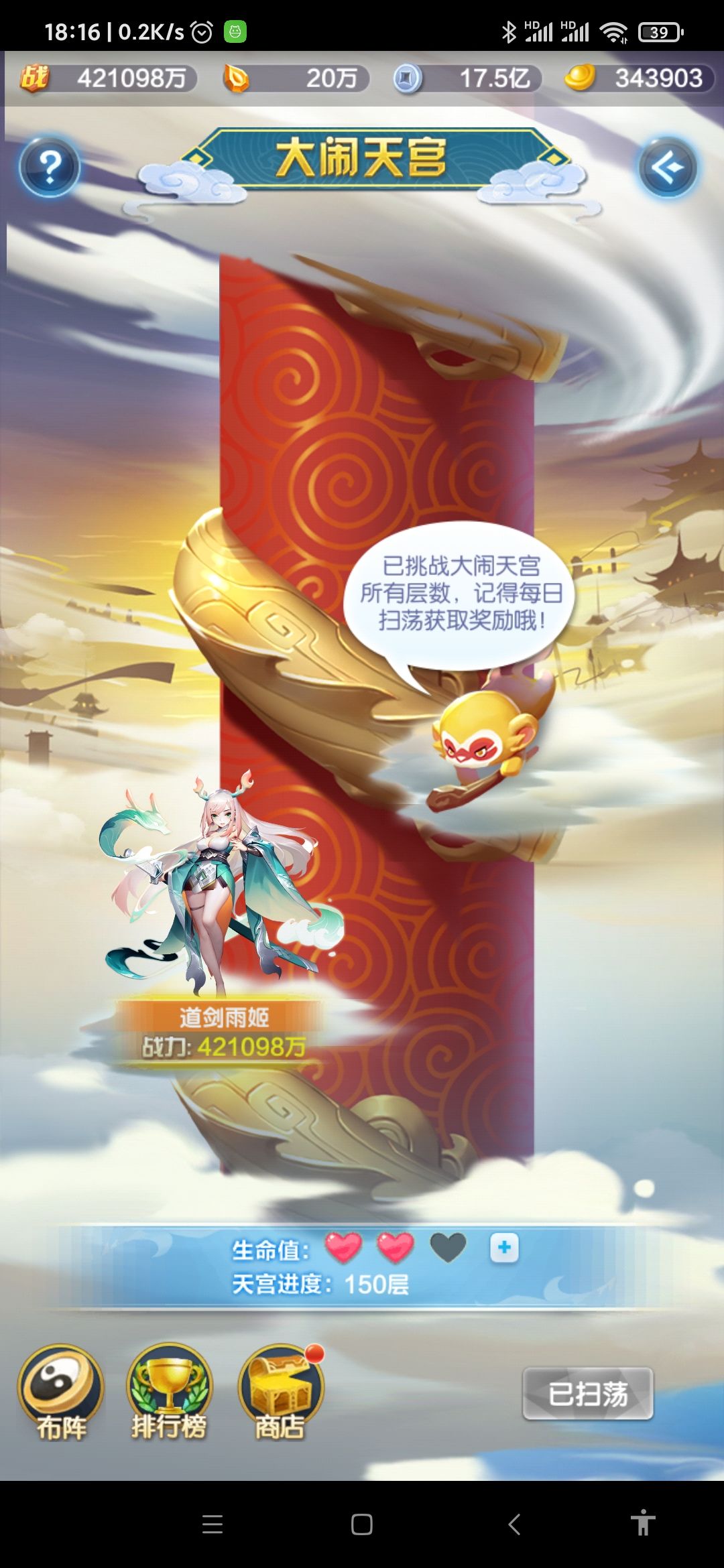 战力42亿、元宝34万,开了紫虚神仙,战力提升幅度很大,天宫终于通关了,副本37章,0星依赖于先手优势,不太会玩战力还是低了,竞技场进前200名有点吃力。