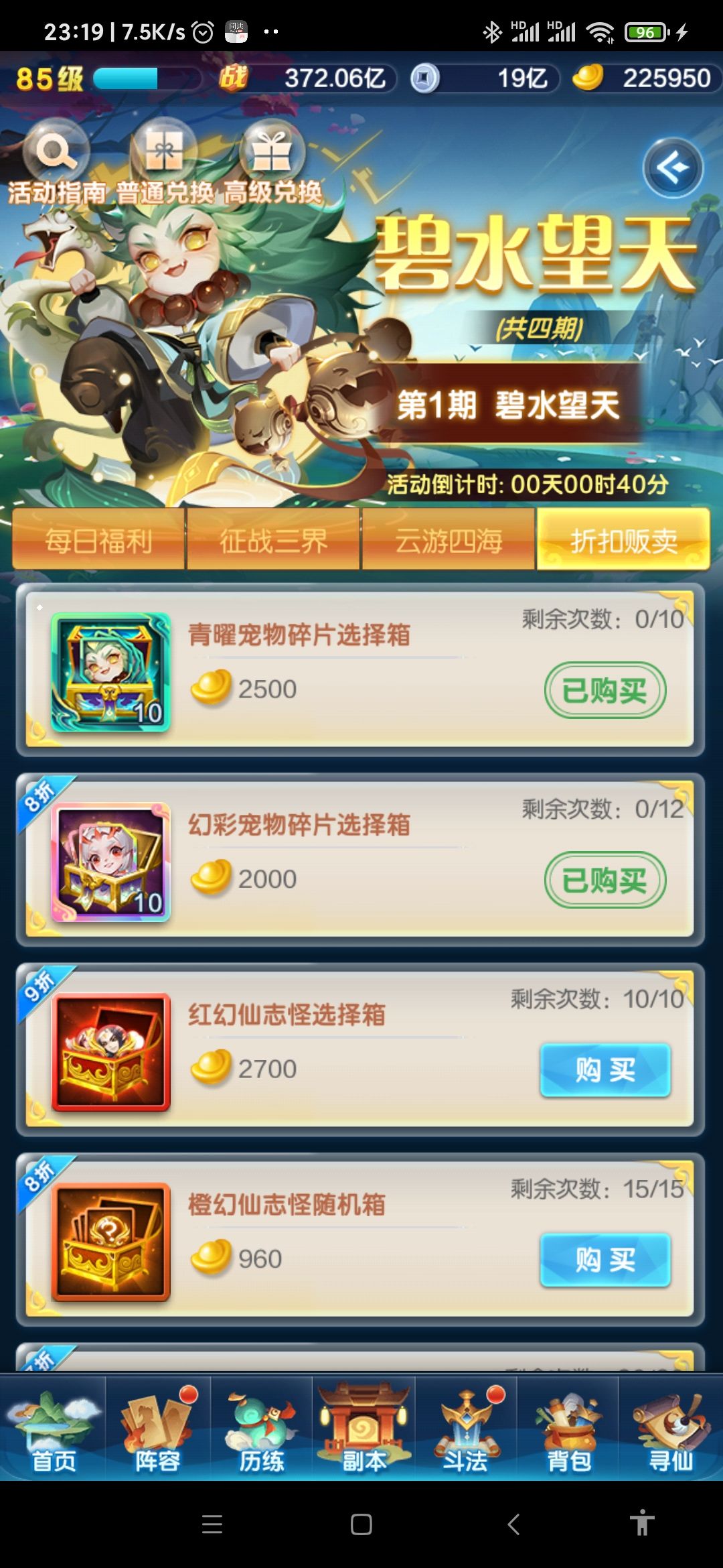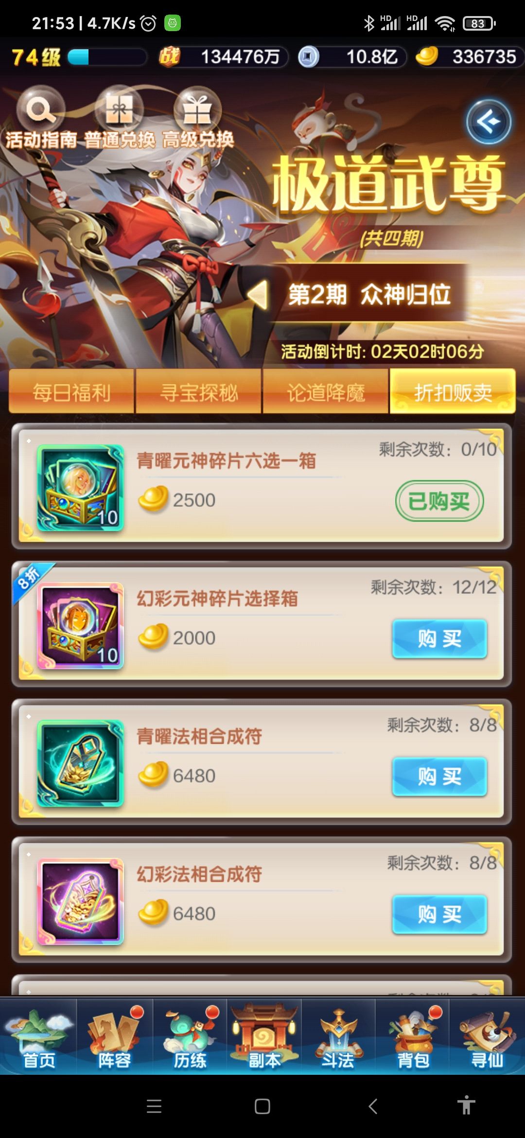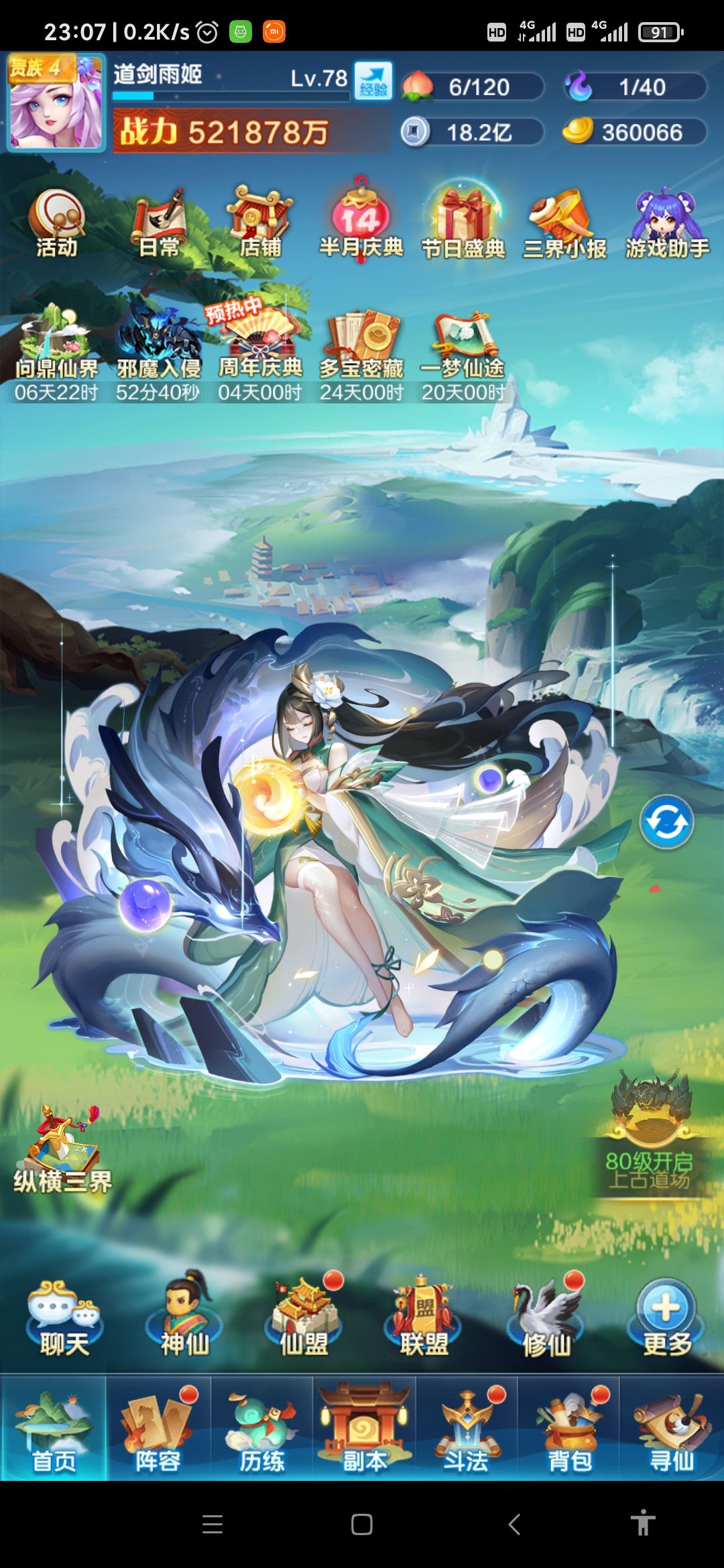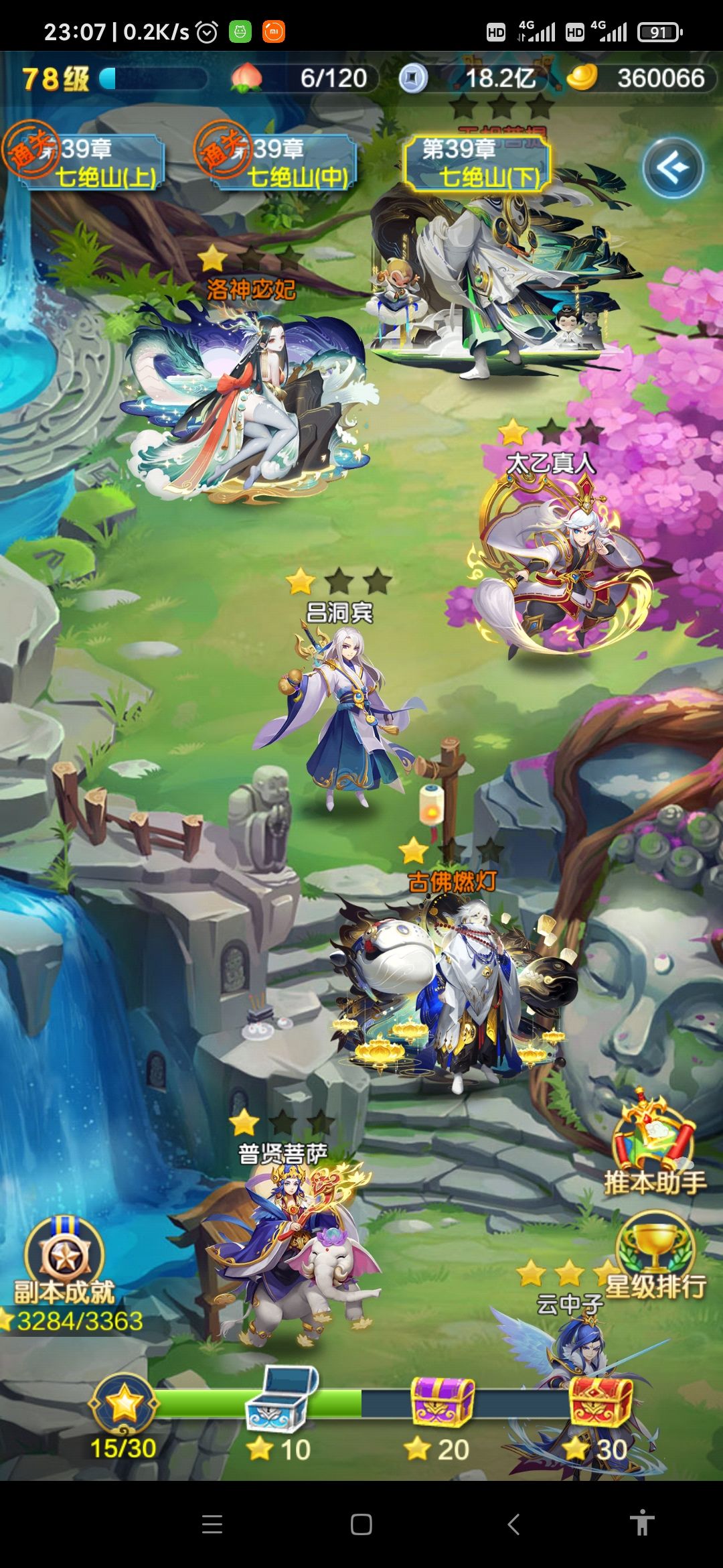 战力42亿、元宝34万,开了紫虚神仙,战力提升幅度很大,天宫终于通关了,副本37章,0星依赖于先手优势,不太会玩战力还是低了,竞技场进前200名有点吃力。
