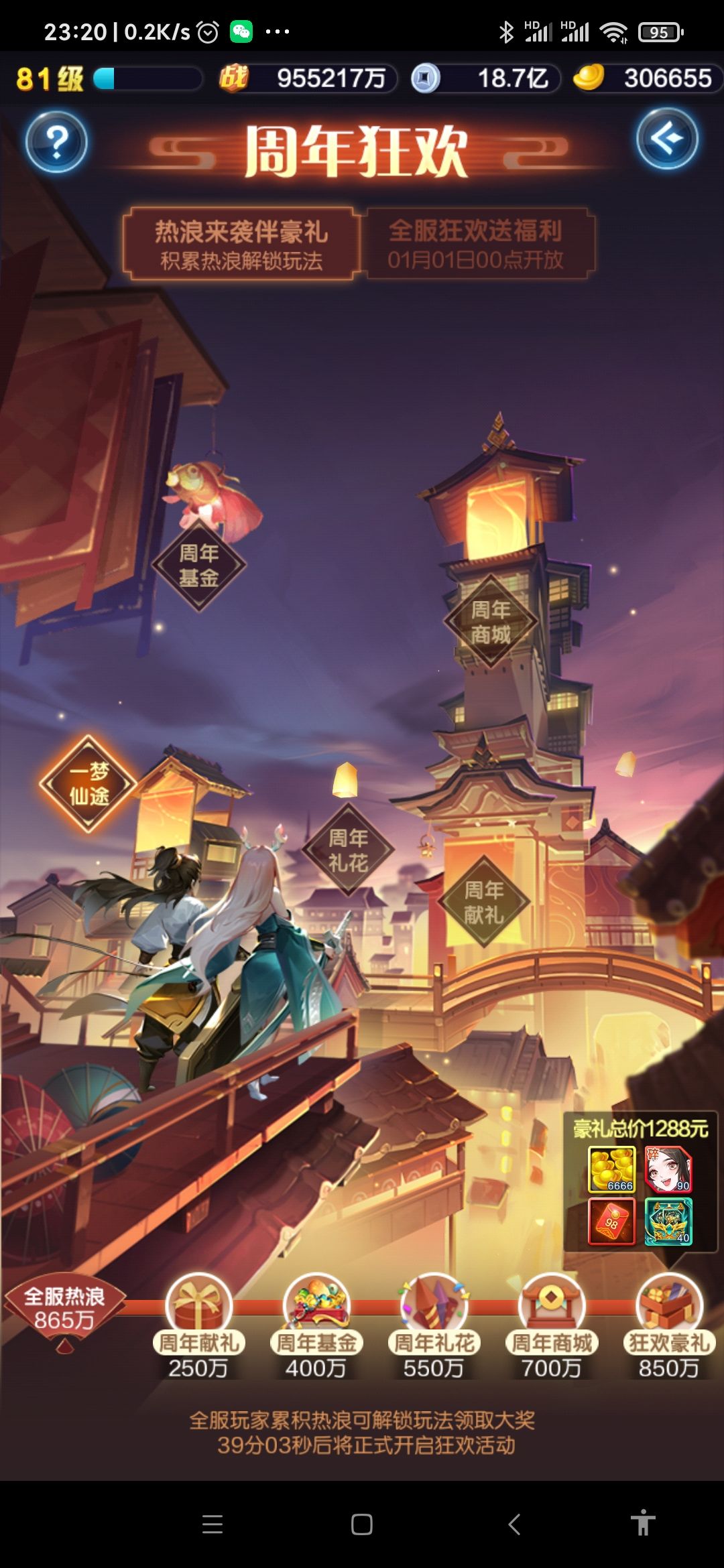 战力95亿、元宝30万,提升较慢到仍然到不了100亿,静待5周年庆典的到来吧。