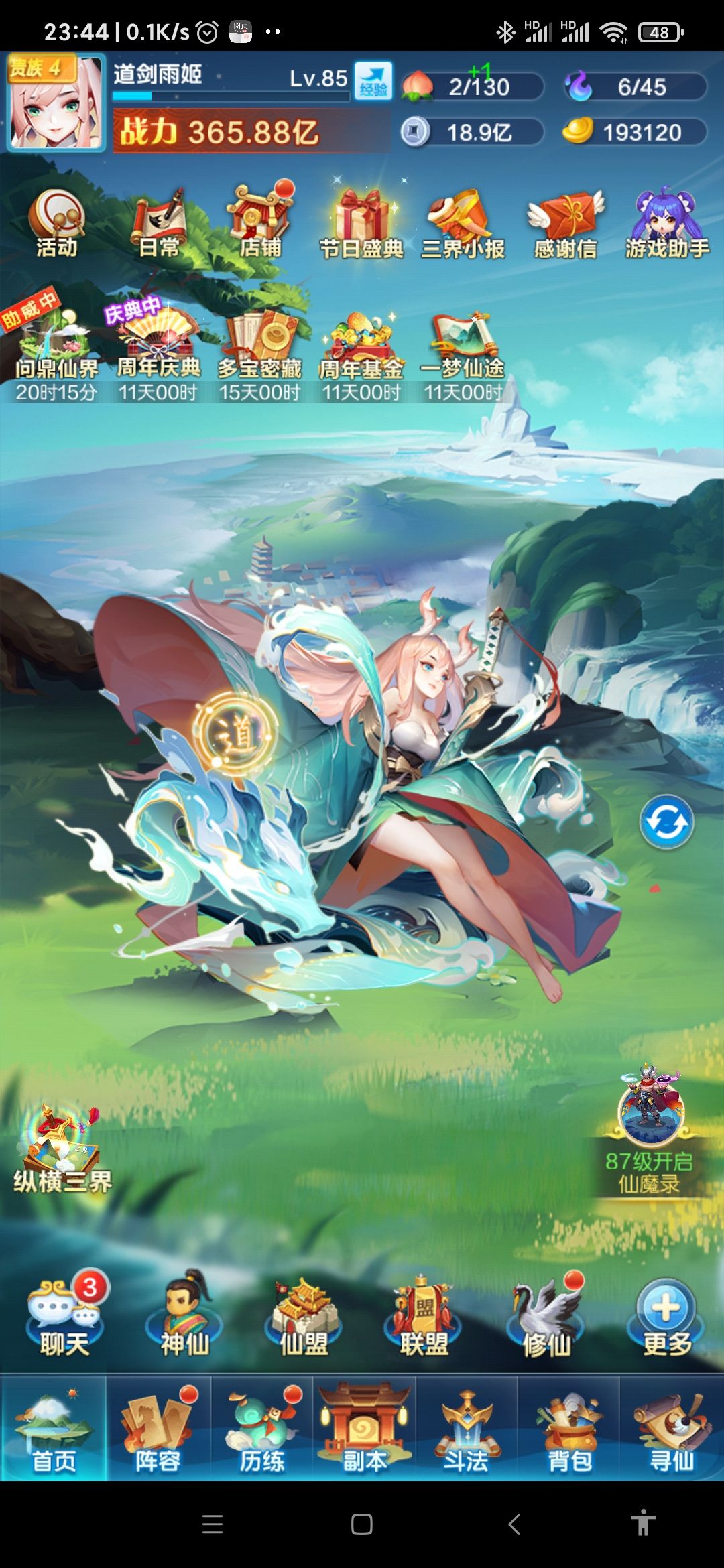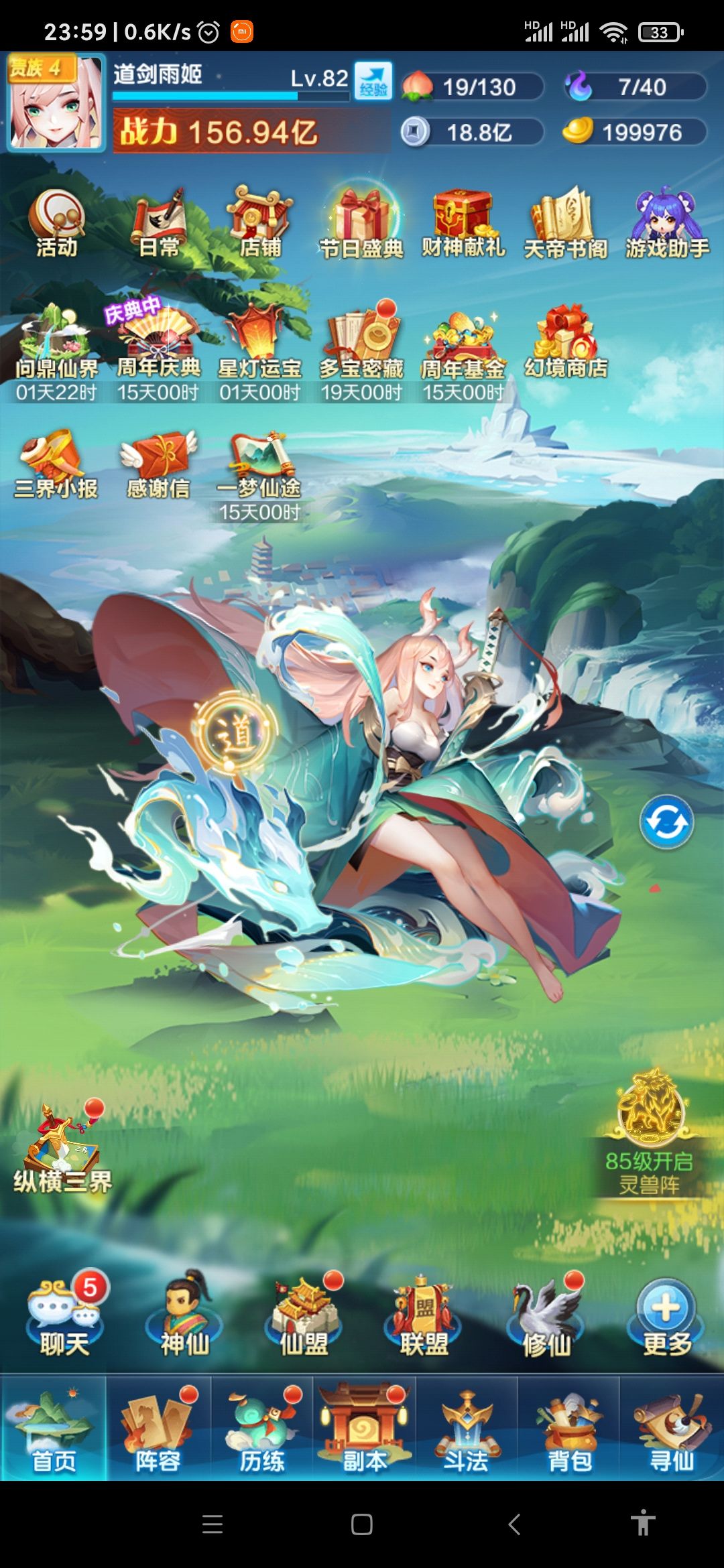 战力10.8888亿(很完美)、元宝还剩33万、副本32章,第一波活动都完成了,明天应该能75级吧,开幻仙后战力会有一波质的提升。