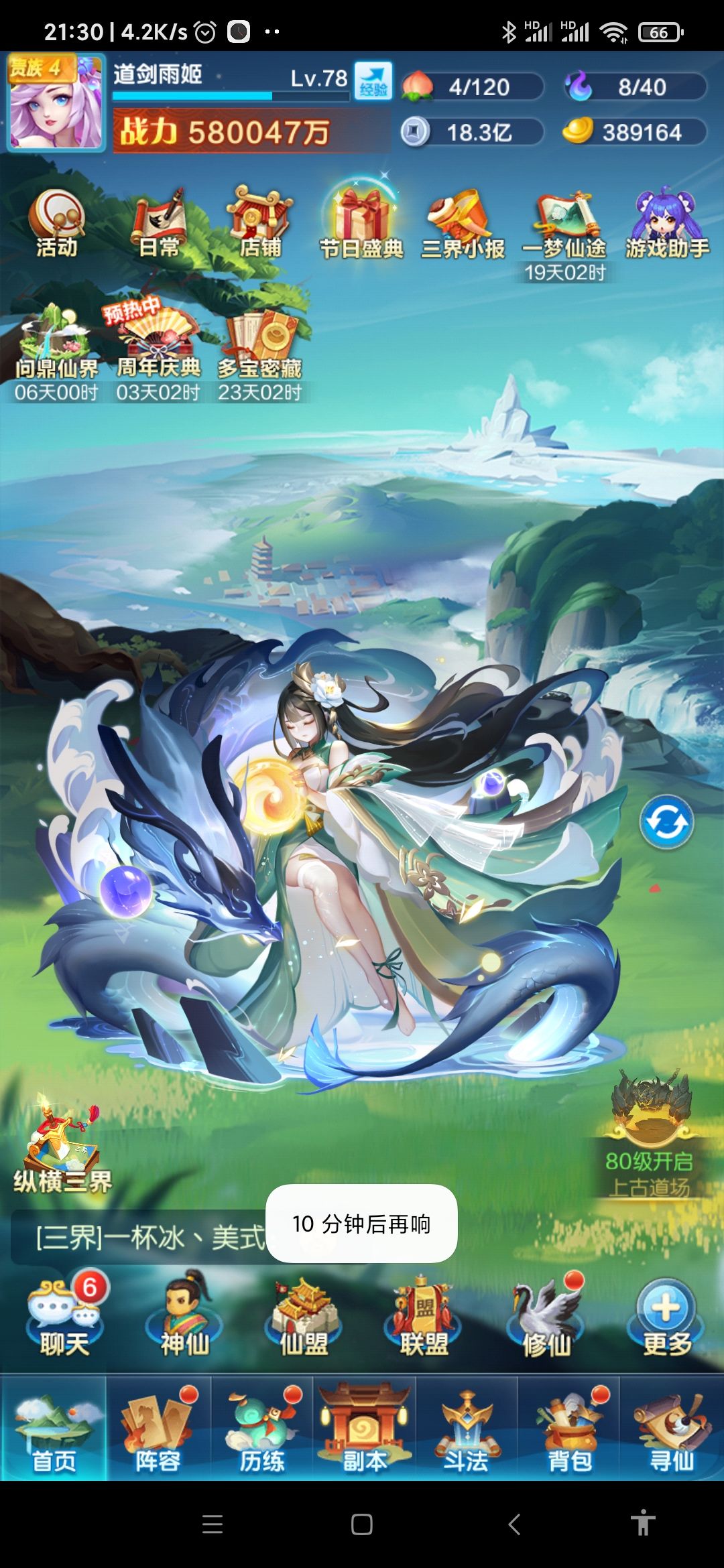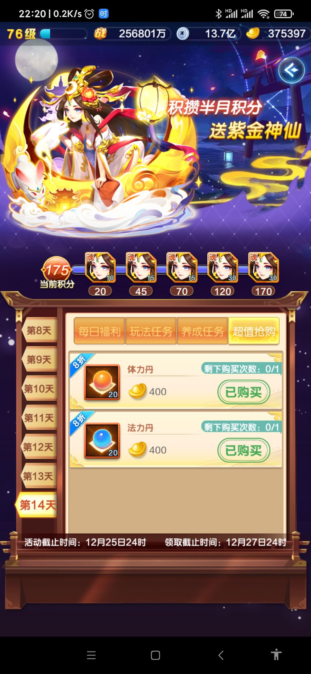 战力13亿、元宝33万,打了500的龙,买了青曜元神,竞技场晋级到大师,黄金场打到第1,过了把冠军瘾。目前升级很慢了,一天一级有点困难了,算了下到75还差70个体丹,明天升75开幻仙没问题了。