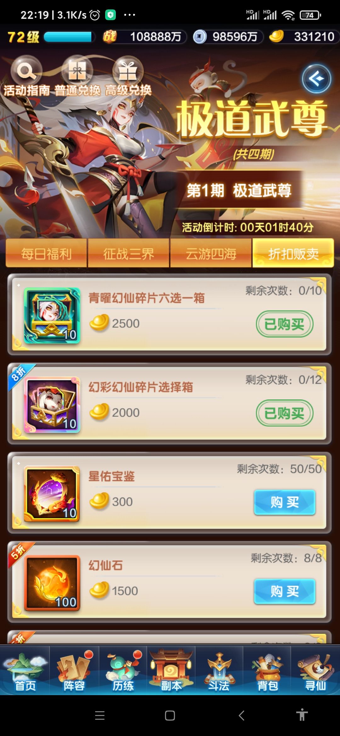 战力8亿、元宝33万、副本31章下、竞技进到前50,换了个炎魔法相居涨了2000万战,都是虚战。群里说22号接出村活动第一期最后一天,需要囤体力丹估毛估108个、云游次数明天存满。(每小时回复2次刚好够)