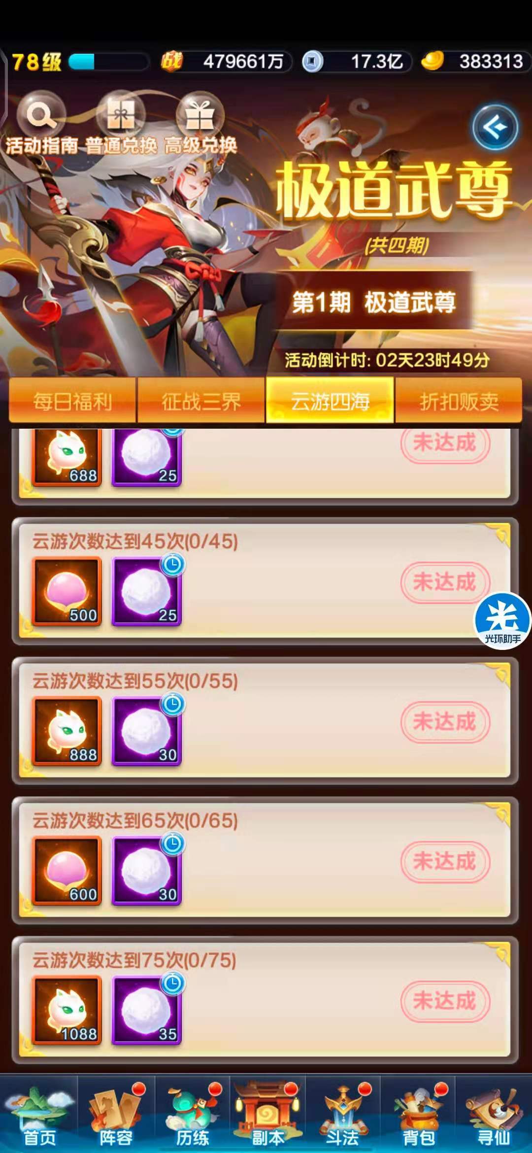 战力没有变化、元宝34万,打了375的龙,试了下500的龙只能打到80%,等明天接了活动应该可以打500的龙了,云游存满了、双丹也囤了一些明天应该够活动用了。
