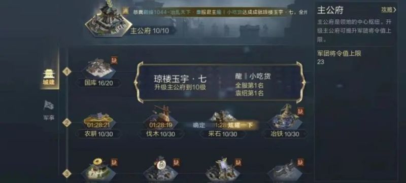 那就先说说势力值吧,鸿图中势力值非常重要,势力值是战斗力的保障,无论是打架还是升级科技都离不开海量的资源,每一块地都是资源,要维持6队主力同时征兵的消耗,这需要足够高的资源产量做保证!