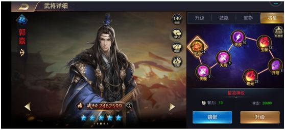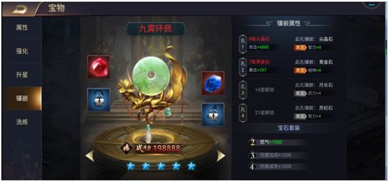 这个提升战力巨大我好好说一下。宝物除了RMB买以外,主要途径就是斩将商城里用过关斩将积分购买。过关斩将(一共200关)每天可以打2次,前期打的关卡数少,积分不是很充足,建议身上攒个1w-2W积分,遇到商城刷出完整宝物的时候一次性购买。100宝物好像是4000积分120宝物6000积分140宝物8400积分,更高级的需要通过合成制作。后期的话每天过关斩将积分的产出还是不错得,基本140的宝物也齐了,每天商城宝物刷新满,把洗练石和主力武将的宝物碎片全都买了。碎片可以用来给宝物升星,宝物精华(这个目前为止不缺)可以强化宝物。然后镶嵌可以给宝物打不同的宝石,宝石平时获得的主要是1级的宝石,遇到节日活动和充值活动等会有高级宝石掉落。宝石的镶嵌不一定要按照他的推荐,比如郭嘉的九霄环佩,我们只要把他加智力的4点弄出来就行了,后面的统帅武力完全不用管他,因此孔3完全不必按他的要求带加抗暴的月长石,你带个绿松石加命中也是可以的。