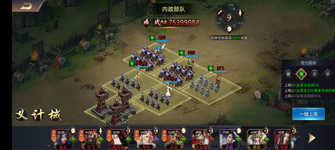 因为这一阶段武将属性不是很高,赵云又是不可替代良将,所以锁定五蜀国拿20%的攻击加成,整体实力提升很可观。