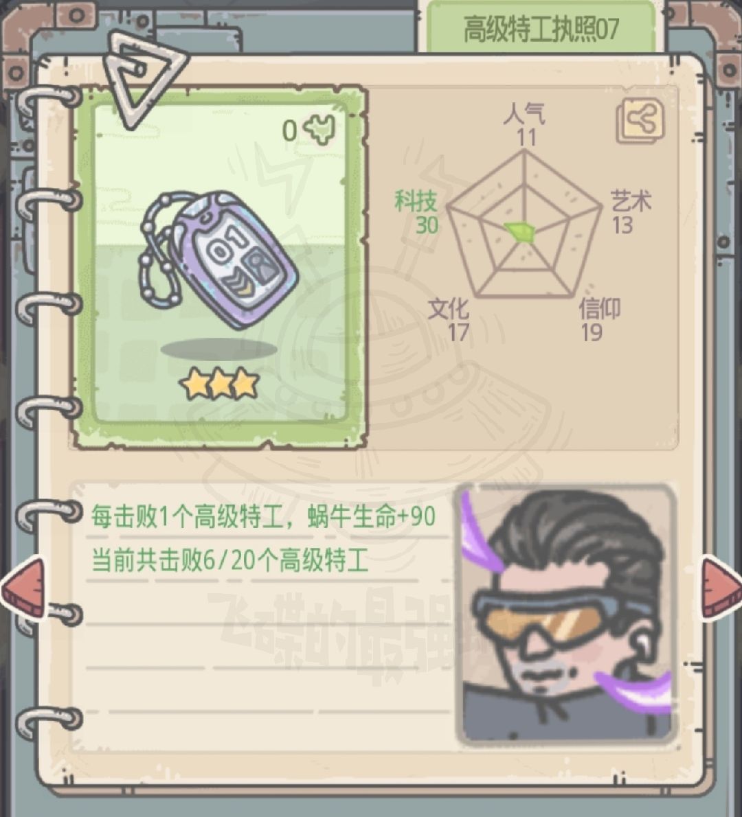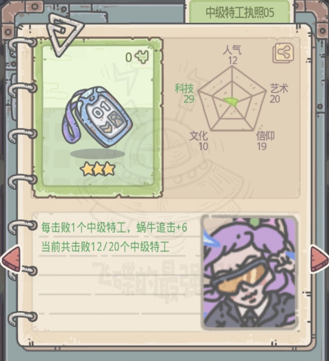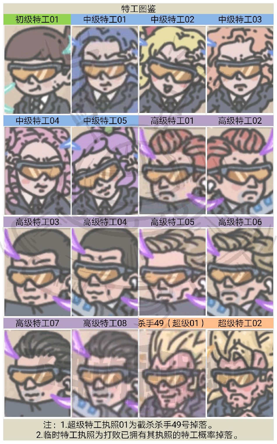 正式执照是击败不同形象的特工掉落(超级特工执照01除外),在碰到特工事件时,选择AA即可(一定要打过ta才行哦,打不过什么都拿不到)。下面奉上正式执照信息以及需击败的特工肖像(可通过邮箱中来信的肖像识别)