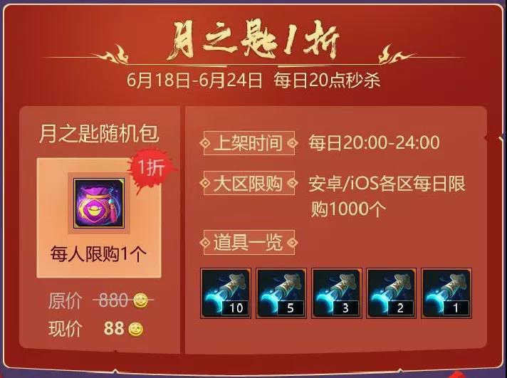 6月18日 - 6月24日,每日20:00 - 24:00,月之匙随机礼包限时1折秒杀,每人限购1个,安卓/IOS各区每日限购1000个。