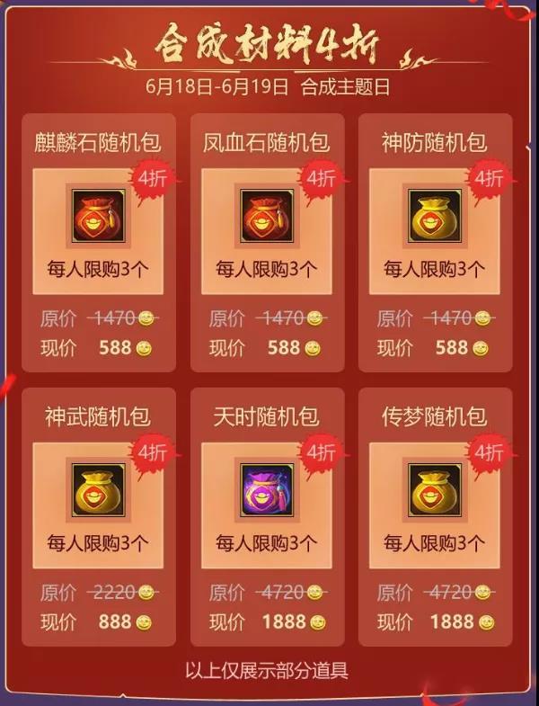 6月18日-6月19日,合成主题日,大量合成材料随机礼包限时4折出售,每人限购3个。