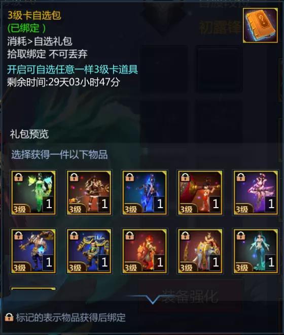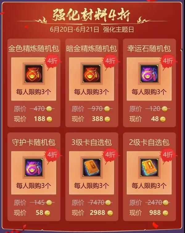 6月20日-6月21日,六大强化材料礼包限时4折出售,其中包含金色精炼随机包、暗金精炼随机包、幸运石随机包、守护卡随机包、3级卡自选包和2级卡自选包。