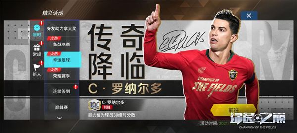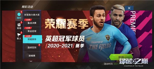 C·罗x佩佩重磅登陆幸运转盘!C·罗传奇之路开启!金币、特训卡、钻石众多道具等你拿!荣耀赛季——2020-2021赛季英超冠军球员球探重磅上线!伯纳多·席尔瓦、马赫雷斯、R·迪亚斯、福登(荣耀赛季卡)等你来抽取!