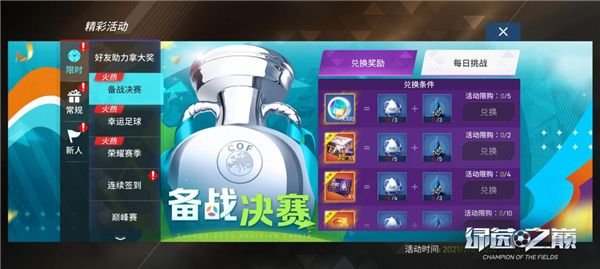7月8日~7月14日,备战决赛火热开启!活动期间,每天将会有4项每日挑战任务,玩家完成任务后可以获取对应数量的集训足球和训练桩。集训足球与训练桩可以用于兑换奖励,欧洲荣誉、自选特训卡[77]、时光车票碎片等好礼等你来兑换!