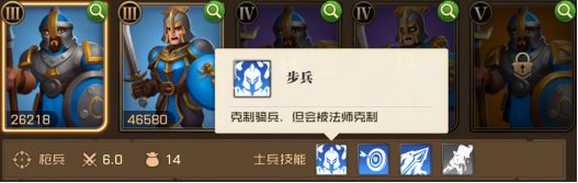 步兵分盾兵和枪兵两个小兵种,其中盾兵作为前排坦克单位,拥有较高的基础生命和防御属性;枪兵是前排输出单位,有高额的基础攻击。步兵对骑兵的克制关系明显,但会被法师所克制。