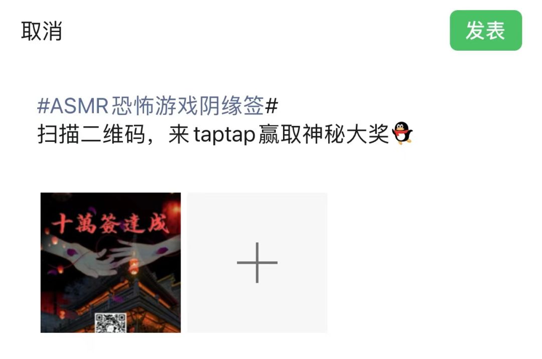添加话题 “#asmr恐怖游戏阴缘签#” 板式参考下图,将分享的截图回复在本帖下方,希望大家理解,我们想让更多的伙伴知道阴缘签这款游戏,阿阴求求大家不要吐槽我们啦,我们会在截止日期当天使用随机数工具进行抽奖,您留言的楼层数就是您的号码,届时阿阴也将会把抽奖视频公布出来,便于大家监督。