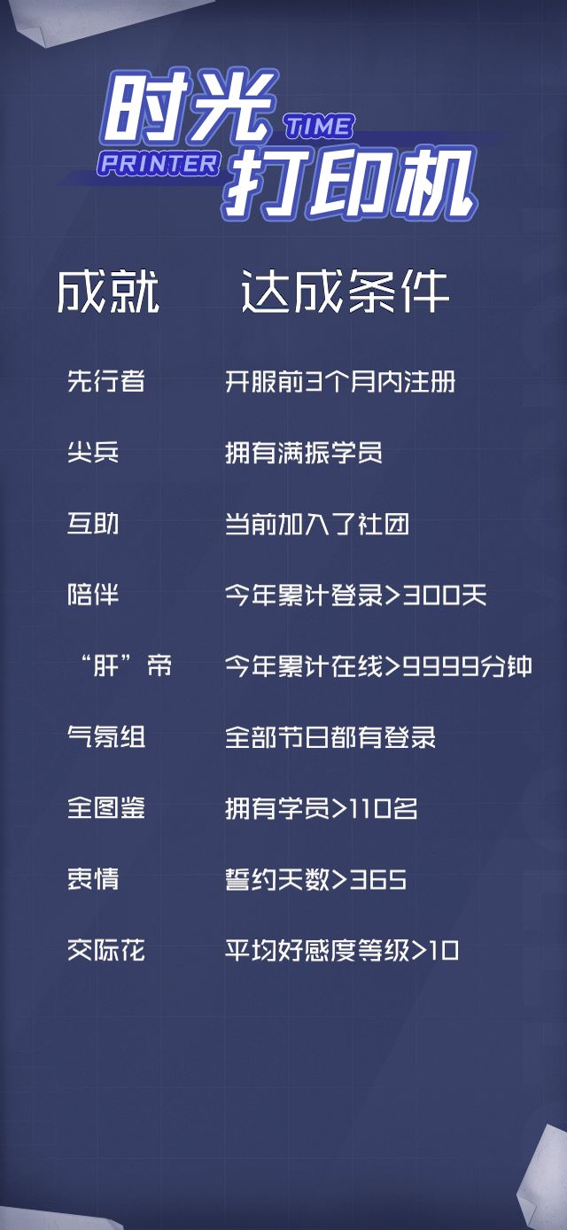 A:后台会根据数据来判定班长是否达成成就。如果班长达成了多个成就,则会按照优先级挑选一个成就进行颁发。同时,这里也给各位班长附上了一份成就图(图片中排序不代表真实后台排序)!