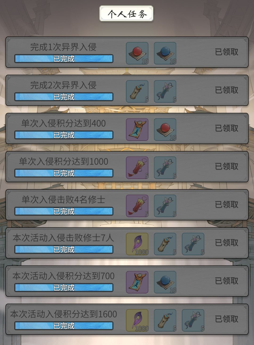 🐠结算方式:周日晚上10.15左右结算,10.00以后破界关闭。最终奖励为 位面排名、个人积分排名、御敌排名、击溃排名 所对应奖励的总和,其中最关键的在于前两个排名,后面的御敌击溃都是蚊子腿。位面总积分就是个人积分总和再乘上本源真灵的系数加成,因此只需要把握好个人积分这一项,就基本能保证异界的奖励大头拿到手。当然,御敌击溃奖励能拿就拿。