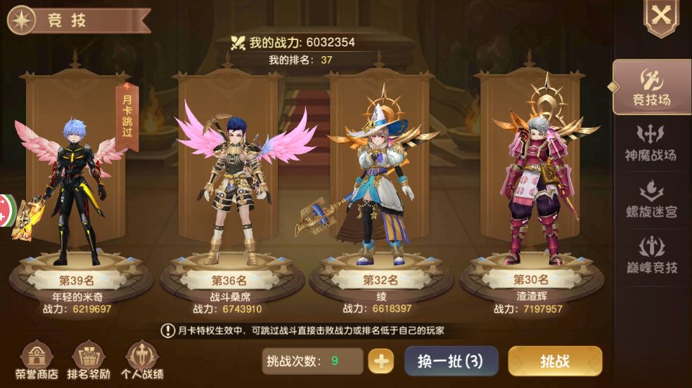 勇者大人每天有10次机会挑战其他玩家(花费钻石可增加挑战次数),挑战胜利则排名互换,挑战失败排名不变。