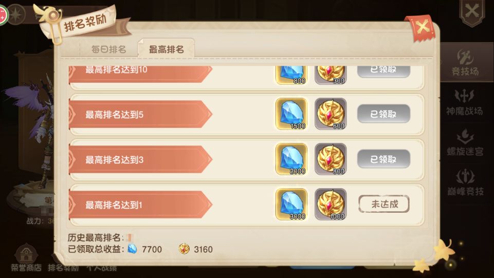 根据排名,勇者大人每日可领取“排名奖励”(奖励包含荣誉值、钻石、纹章材料),不断冲刺排名还可领取最高排名奖励哦~