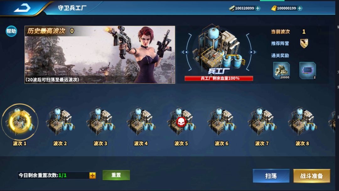 5. 每天可以重置挑战进度,重置后玩家可以重头进行挑战,也可以通过扫荡快速达到通关最大波次的前5关,通关20波后可直接扫荡至当前最远波次
