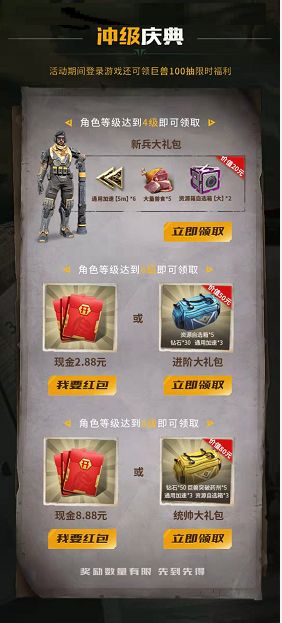 活动期间,新用户角色达到指定等级即可领取限时丰富奖励,数量有限,先到先得!