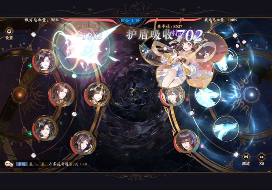 阵容只有了了唐堂满破,没有月怜这样的优质前排顶在前面,实在吃不住对面伤害,干脆使用概率大法重复多次攻略,终于让唐堂(41级带了玉兔凑血,品阶只有3-1)成功晕到目标,让玉泽有机会先偷掉对面后排,并带子神和酋鸡保证自己先手。