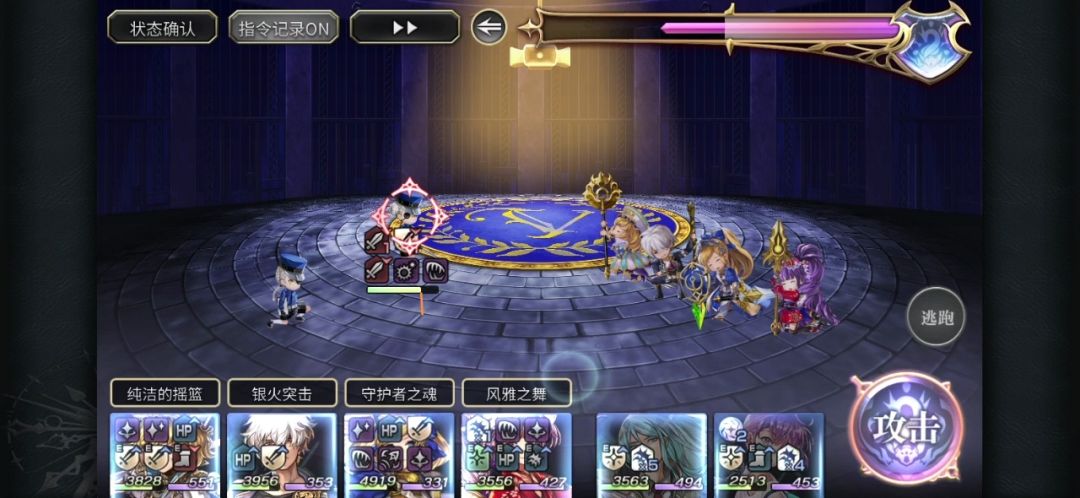 出af后第一回合蝶火切玛丽,玛丽一直加血,芙兰加血,其他人一直输出,期间国王记得补双降,攒出整管af,然后开秒(由于随手录的,视频中没有攒满,所以这个阶段我打的比较久,可以更快的)。此时剩余血量应该不太多,就快转阶段了,出af后芙兰加血,玛丽加血,其他人输出,直到boss放完地属性攻击,下回合芙兰玛丽加血,国王换安娜。再下一回合,芙兰换蝶火,开始进入循环,打至转阶段。循环原则,同回合boss放地攻击安娜降力,玛丽加血,boss放物理攻击,安娜降智,玛丽加盾,boss放火攻击,安娜加hp上限,玛丽加血,上图有技能表可以判断boss每回合技能。需要注意的是当快要转阶段时,改变循环,安娜降力,加hp上限,两个技能循环,玛丽无限加血,切记,这个不能错,杰德和蝶火玩命输出,记得没有降智的时候蝶火补个降智,打进下一阶段