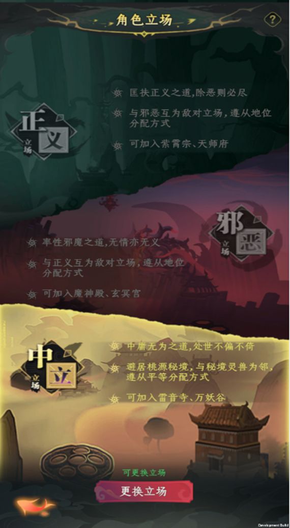 如果想加入的门派不属于当前立场,可以自行更改立场(立场按钮在左上角战力旁边),每次转换立场后有7天冷却时间。