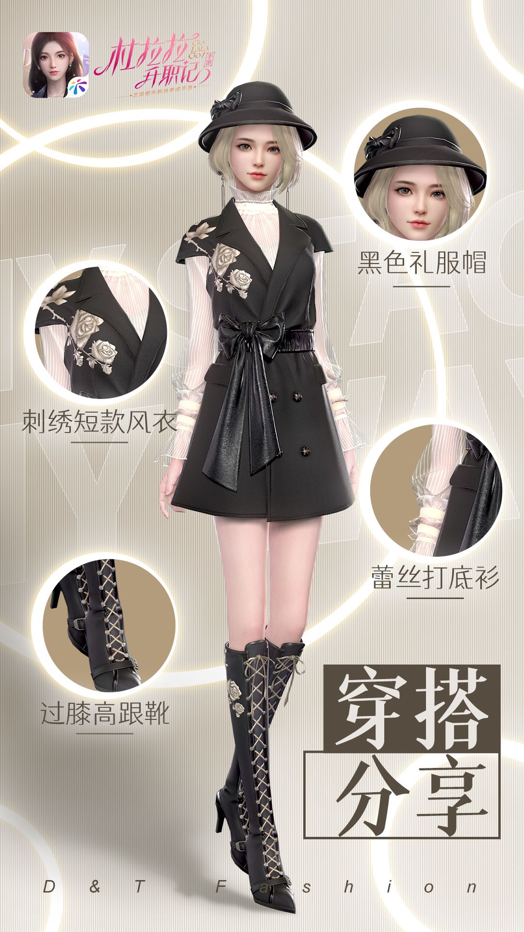 一顶黑色的小礼帽,永远是英伦风格中不可或缺的经典元素,隐约中散发着一丝贵族的高精致感。绣着金玫瑰的长靴,与上衣的刺绣相呼应,搭配短裙更显腿长~