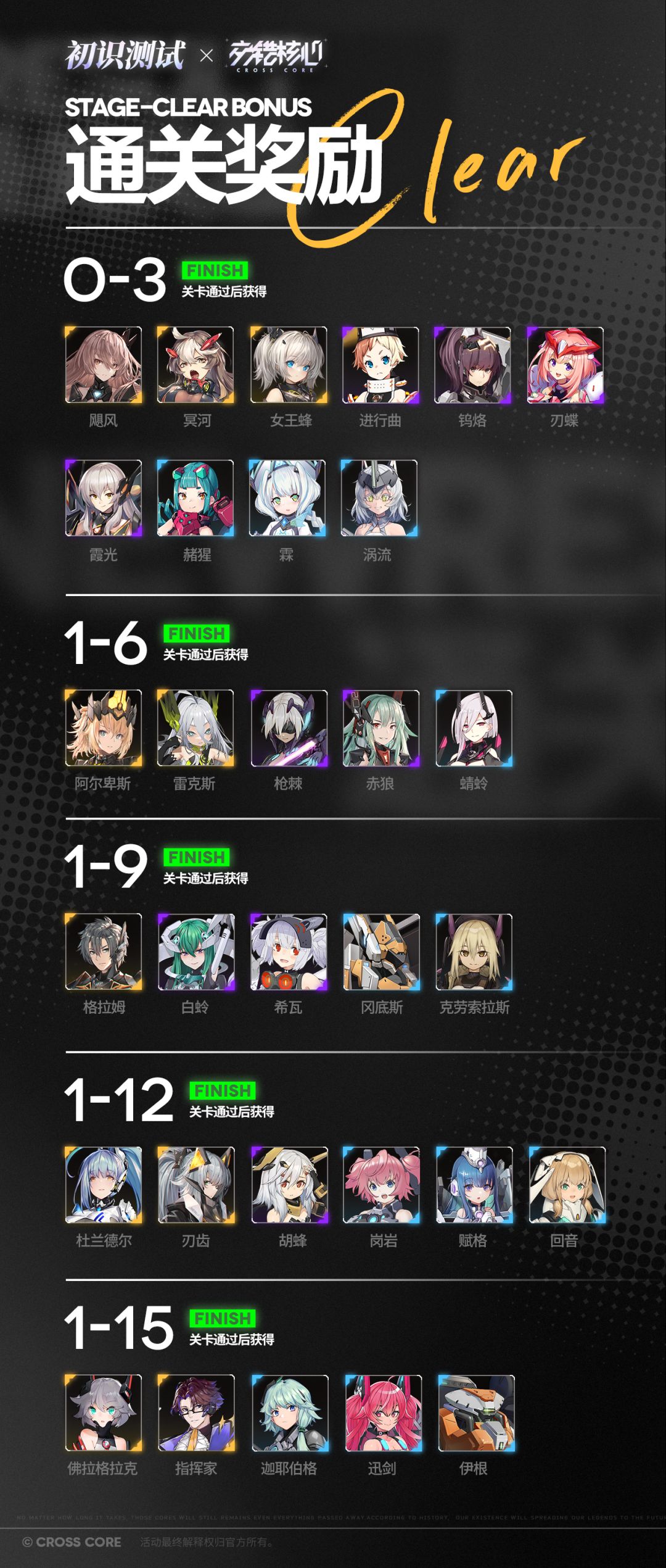 初识测试期内,首次通关特定的关卡,即可获得相应的角色作为通关奖励。