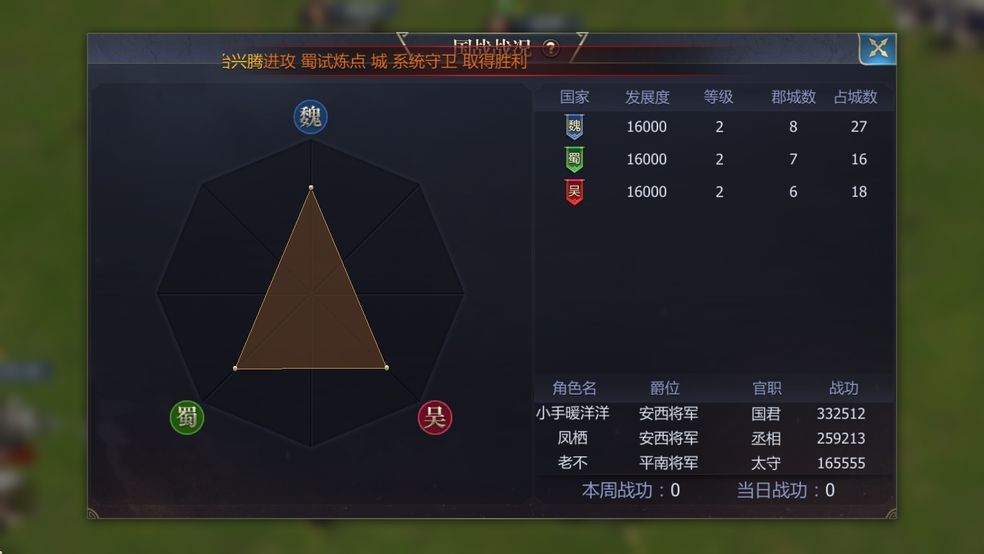 3、每日结算时,将根据国家占城数量和本国玩家战功排名进行奖励分红,占领关键城池如洛阳可获得金锭等稀有奖励。