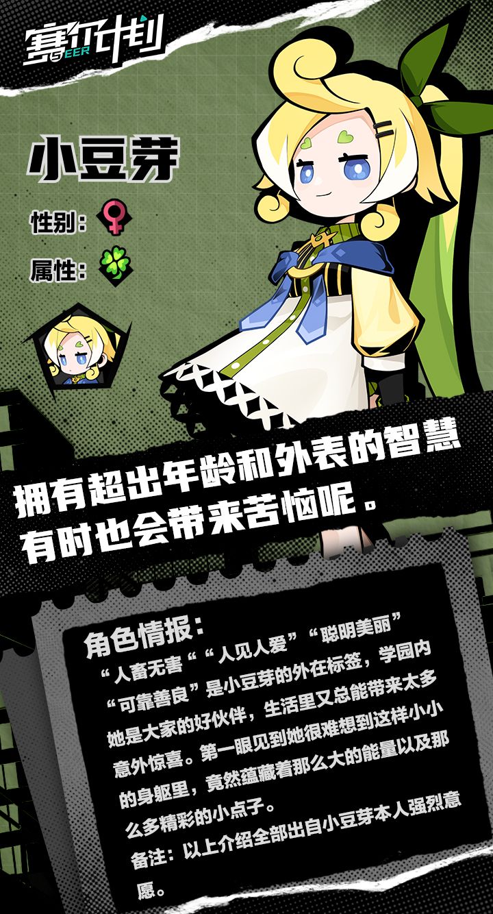 近日,《赛尔计划》制作组发布了新一期的角色情报专栏,专栏中给出了新角色“小豆芽”的立绘形象及资料介绍。