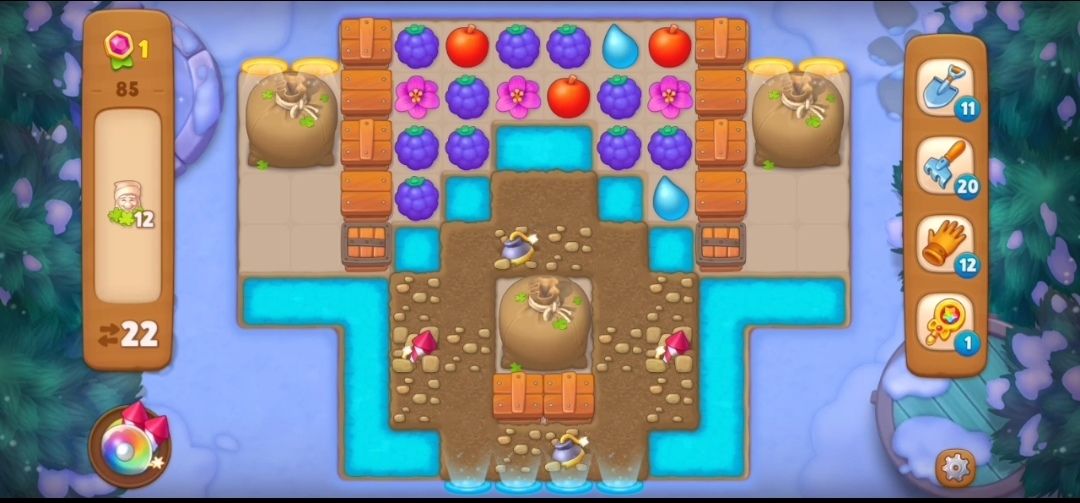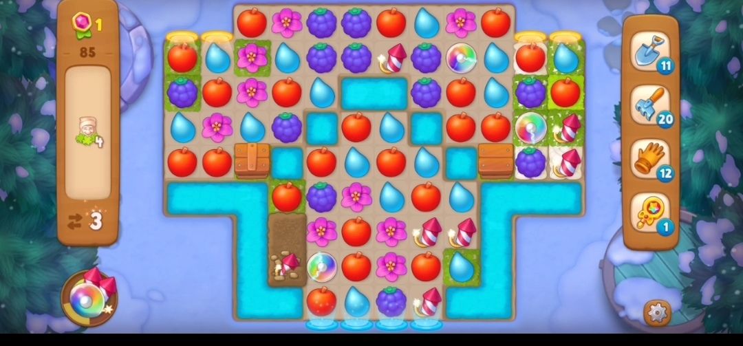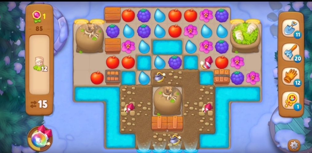 ③阻碍树叶袋的箱子消除之后就要开始消除树叶袋,需要在树叶袋旁边进行三次元素匹配消除。一共是三个树叶袋,我们一个一个来,因为最下面的树叶袋被土块围住,所以我们先选择上面两个树叶袋。