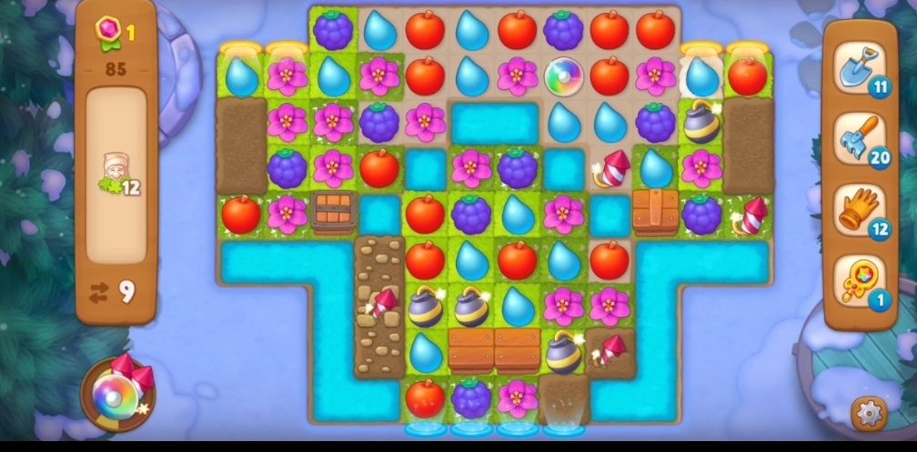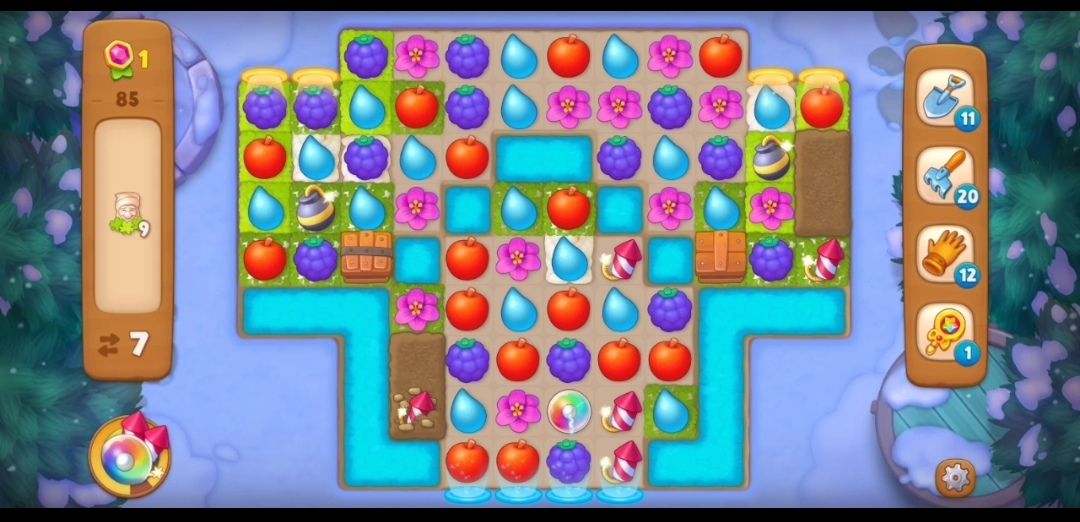 ⑥还是要尽量进行元素交换,厚的土块箱子还是通过交换元素造炸弹彩虹过关比较快,利用好关卡里一切能利用的元素,就可以过关啦。