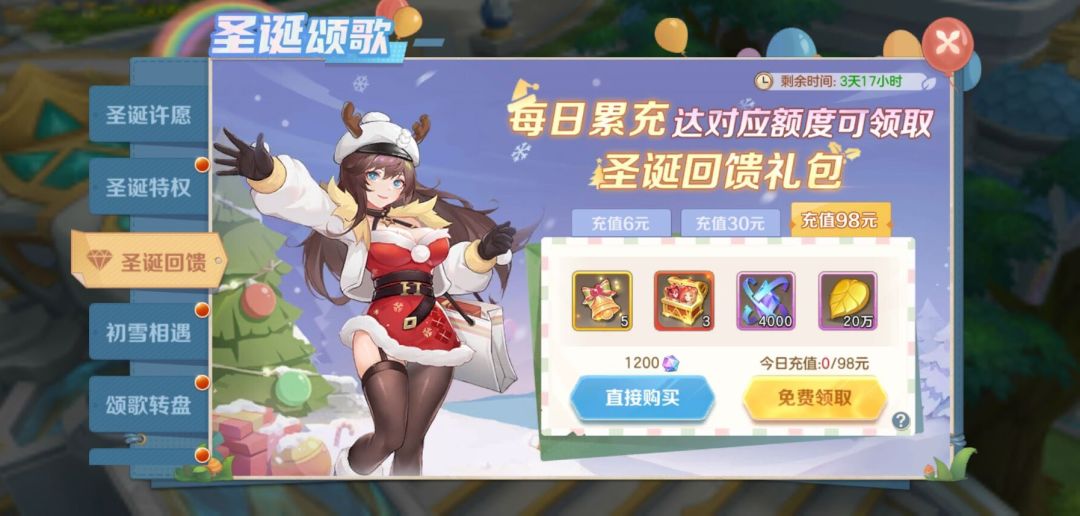 每日充值指定金额即可领取圣诞回馈礼包奖励回馈礼包亦可消耗钻石直接购买。奖励由已开放系统决定,随玩家等级变化活动期间每日05:00刷新,记得领取奖励哦~