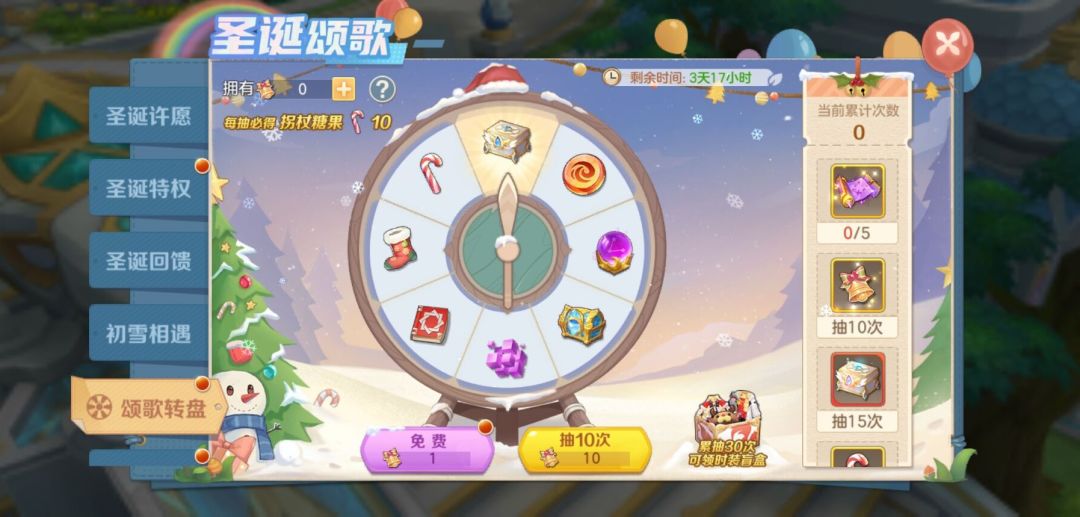 使用祝福响铃启动颂歌转盘,领取随机的丰厚奖励每个图标有对应的奖池,点击图标可浏览奖池奖励每抽必出拐杖糖果x10,累计抽取30次可领圣诞时装盲盒拐杖糖可到缤纷兑换活动中换取好礼,圣诞礼袜可到珍宝商店兑换更多好礼哦~奖励由已开放系统决定,随玩家等级变化概率公示: