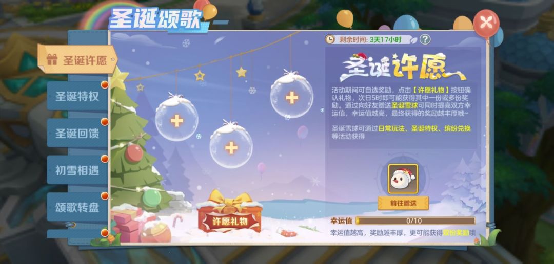 活动期间可自选奖励,点击【许愿礼物】按钮确认礼物,次日5时即可能获得其中一份或多份奖励。通过向好友赠送圣诞雪球可同时提高双方幸运值,幸运值越高,最终获得的奖励越丰厚哦~
