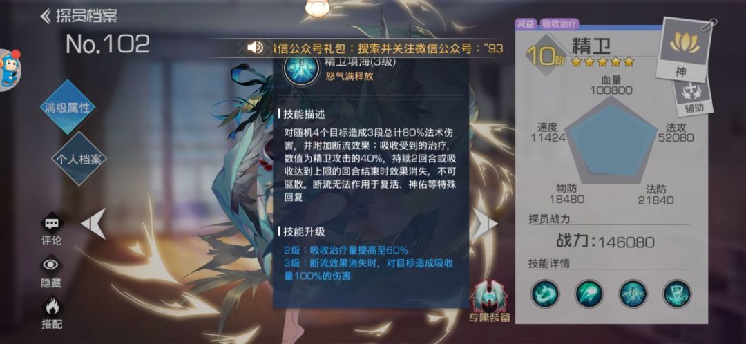 来,我们换一种思路打开方式,两极反转! 吸收奶量在回合结束或者被驱散后会造成吸收值等额的伤害,重点在于这个伤害基本可以确定的是无法衰减,什么意思呢,例如吸收1000万奶,造成等额伤害时,防御,免伤,最终减免等都无法改变这个伤害值,无视防御免伤终免的固定值伤害,有了这个思路,精卫的定位可否从辅助变为一攻的辅c呢?