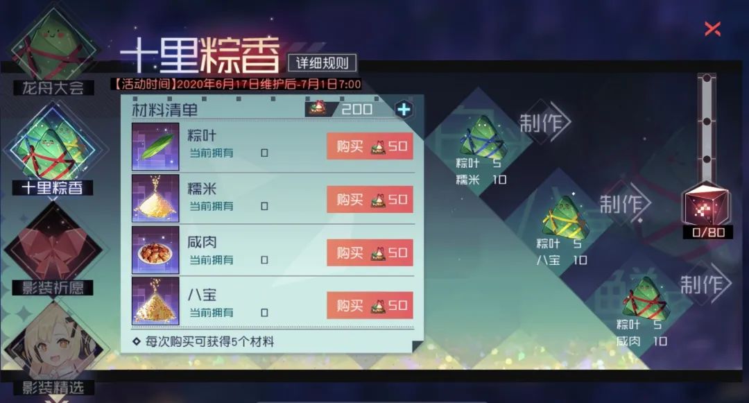 使用一定量的粽叶,加上馅料,即可做出白粽子、肉粽子以及八宝粽子!制作完成1份不同粽子时,可以获取对应的道具奖励。同时,制作粽子总数达到一定数量时,可分别领取进度奖励。