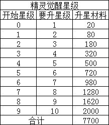 7.关于精灵觉醒和光环消耗。精灵觉醒升星需要的材料数量为(20*要升的等级^2),比如9升10需要20*10^2=2000个材料,所以从0升到10一共需要7700个升星材料;精灵光环升级消耗材料数量为(要升的等级^2+4),比如99升100需要100^2+4=10004个星光粉尘,所以从0升到100一共需要338750个星光粉尘,需要的金币为星光粉尘的3万倍,不多,总共就101.625亿。