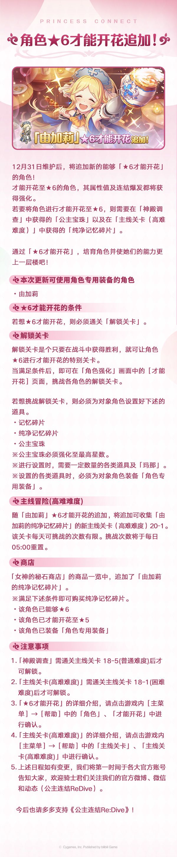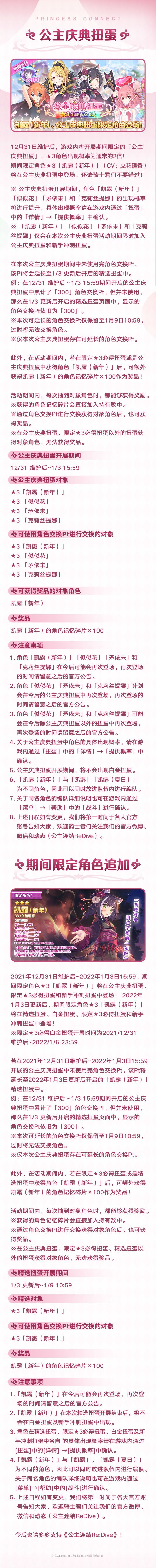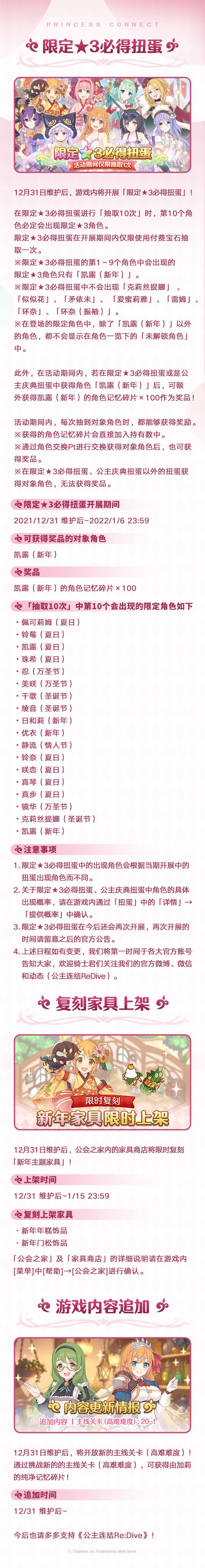 维护结束后,游戏内将开启★3角色出现率2倍的「公主庆典扭蛋」,期间限定角色★3「凯露(新年)」(CV:立花理香)及公主庆典限定角色将在「公主庆典扭蛋」中限时登场,游戏内将开展限定★3必得扭蛋;公会之家将限时复刻新年主题家具;同时,「★6才能开花」将追加新角色,并追加新的游戏内容!