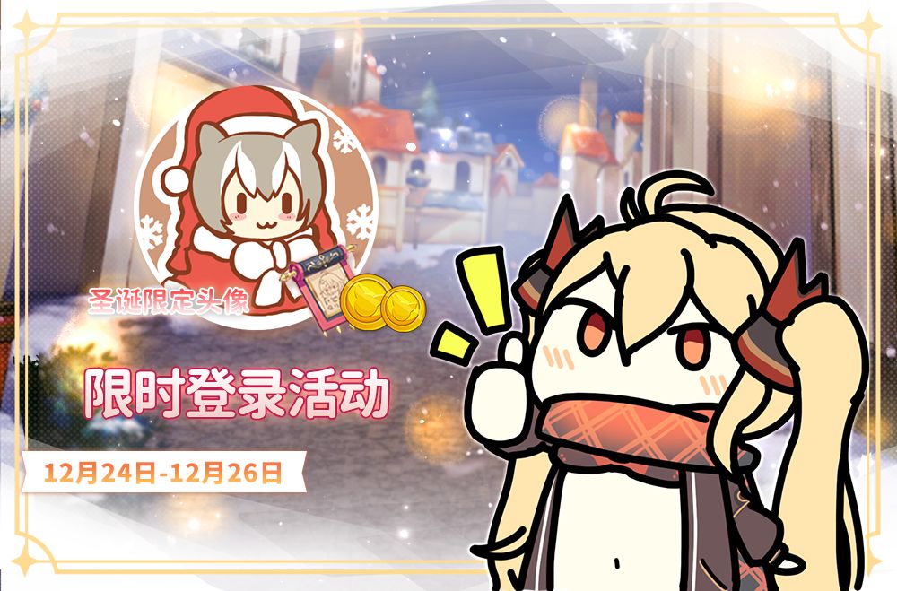 「12/24 5:00」~「12/26 23:59」期间,每天登录游戏即可领取福利~